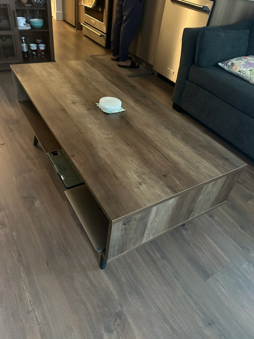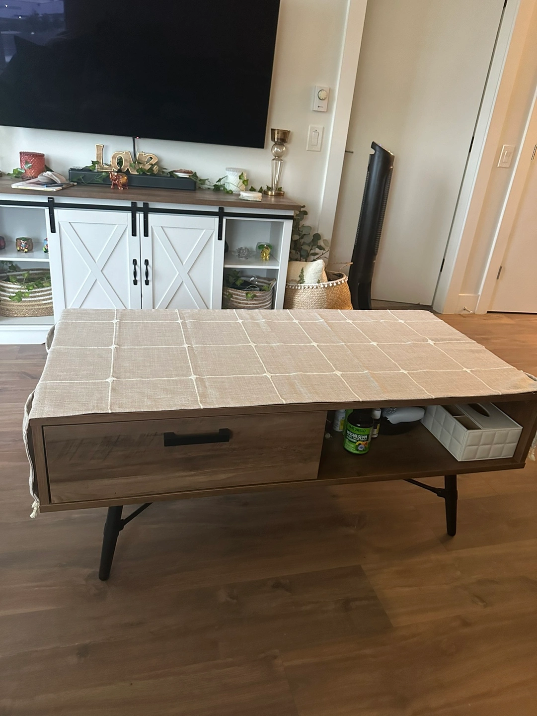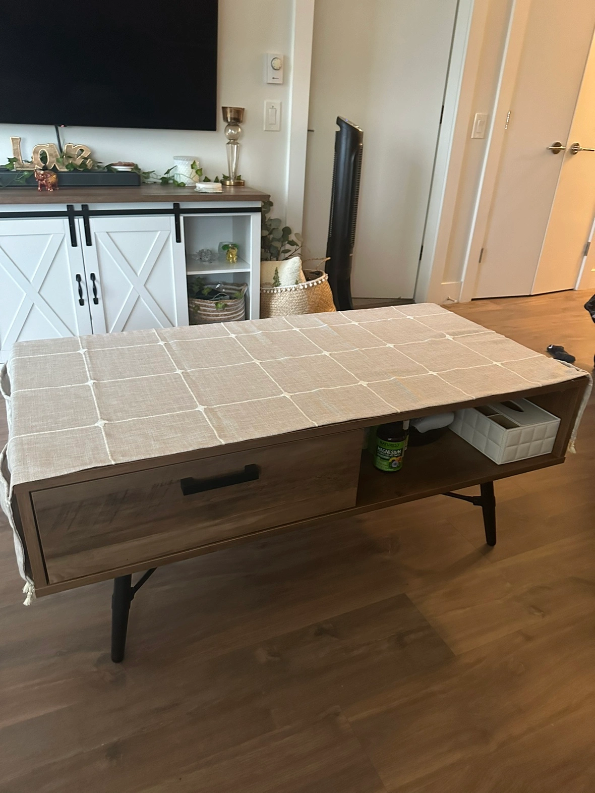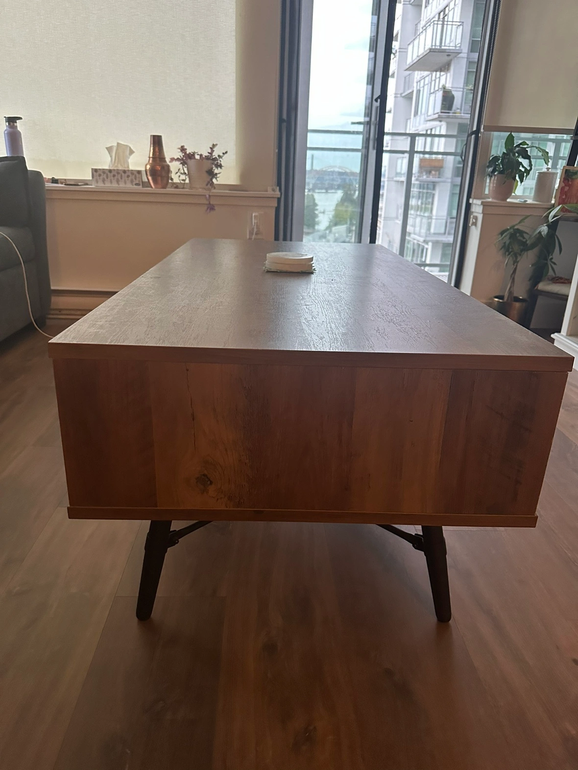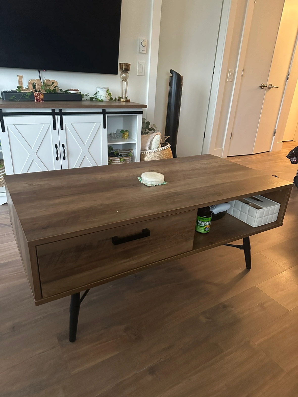Modern coffee table with a drawer and open shelves. It has black metal legs and a matte woodgrain finish. Pick @ 268 Nelson’s crt.