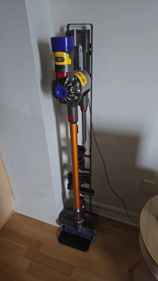 Dyson V8 Vacuum with all attachments and black metal stand.