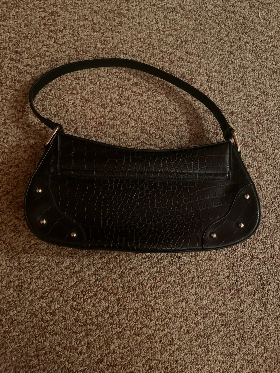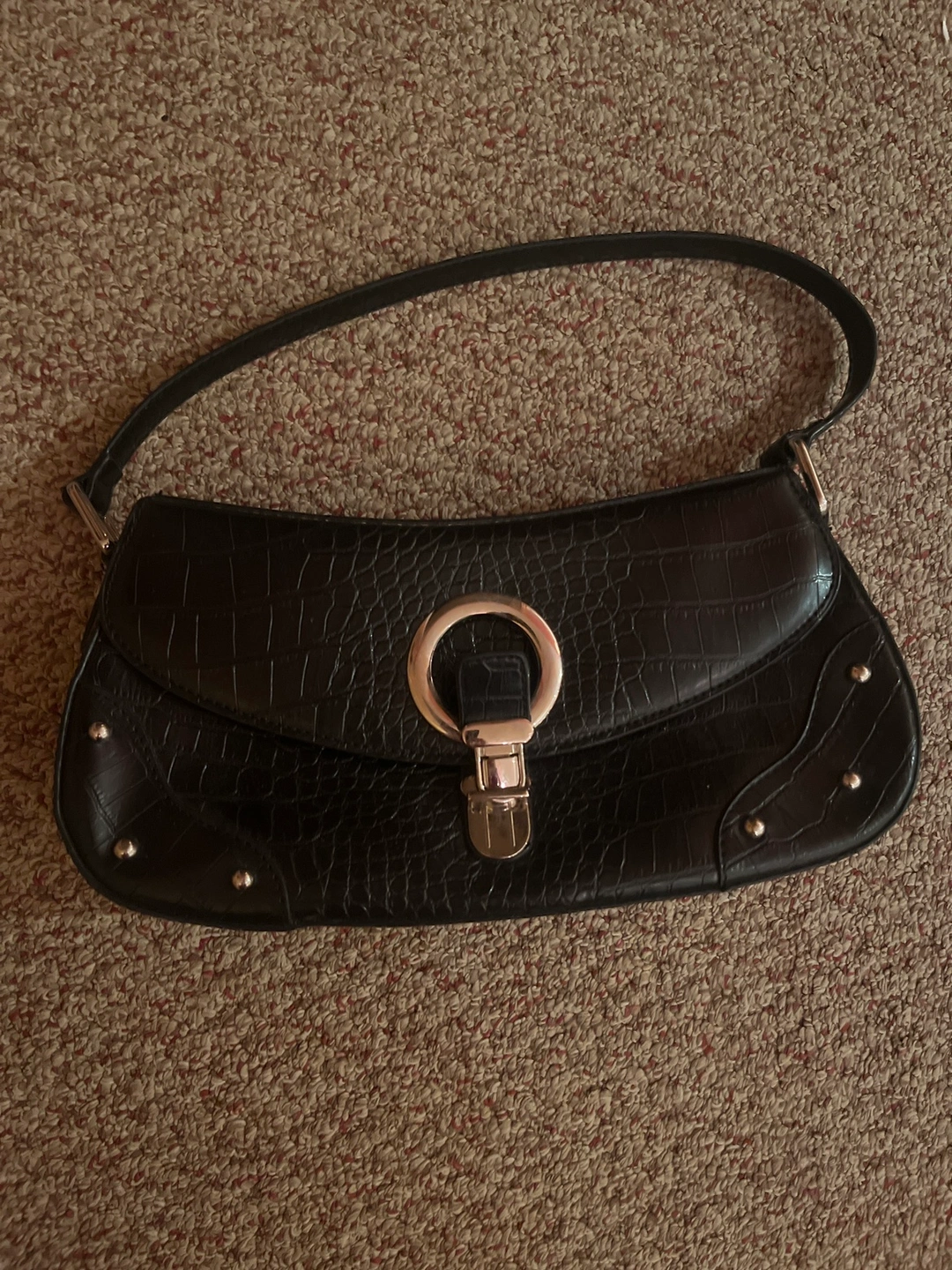 Black handbag with a crocodile print. It has a top handle, a flap closure with a gold ring and a gold buckle. It features a small inner pocket. It’s in very good condition.