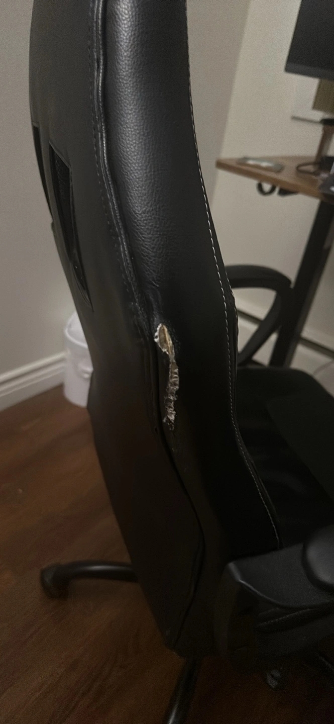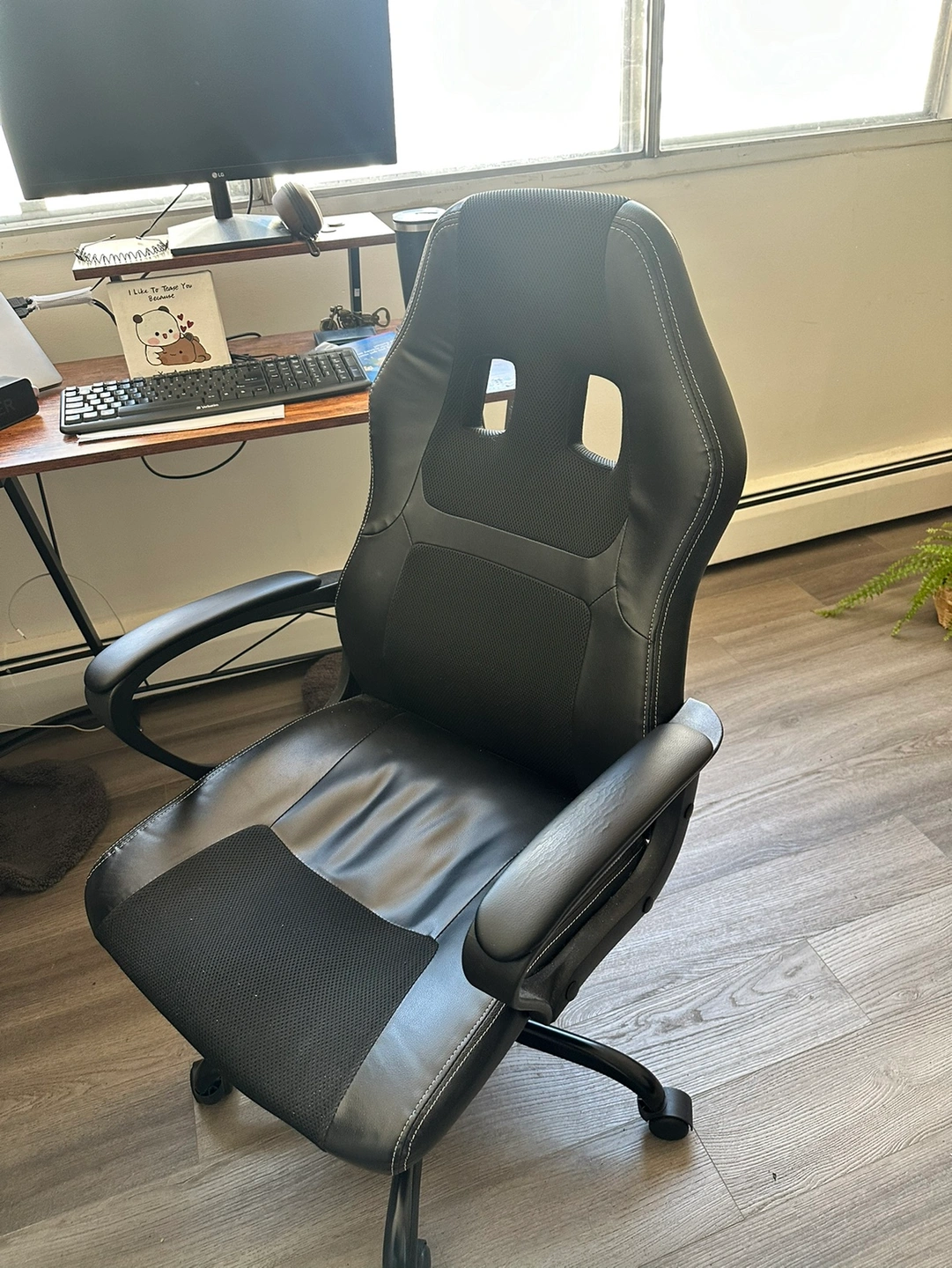 Black gaming chair with white stitching. It has a mesh back and a padded seat. It has one bit wear and tear as in the images.