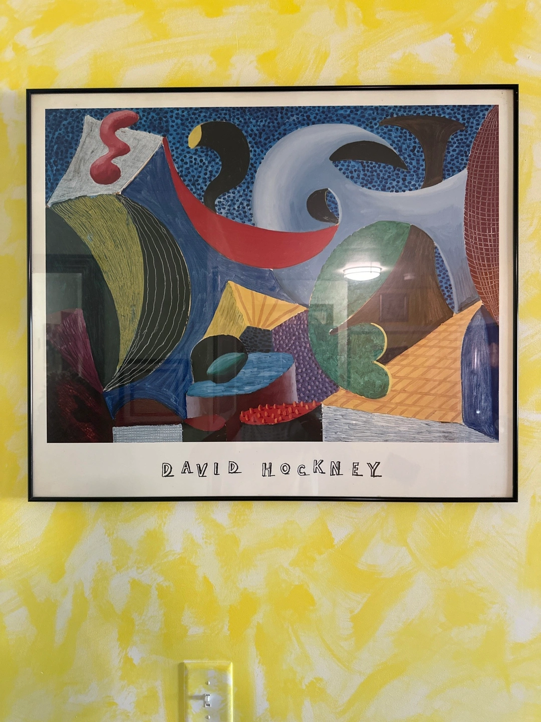 Framed art print of a David Hockney artwork. The print is framed in black and has a white mat. The artwork features abstract shapes and colors. David Hockney “The Seventeenth 1994 thank you pick up Bx