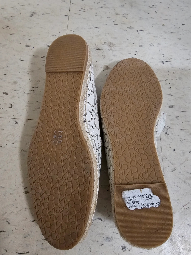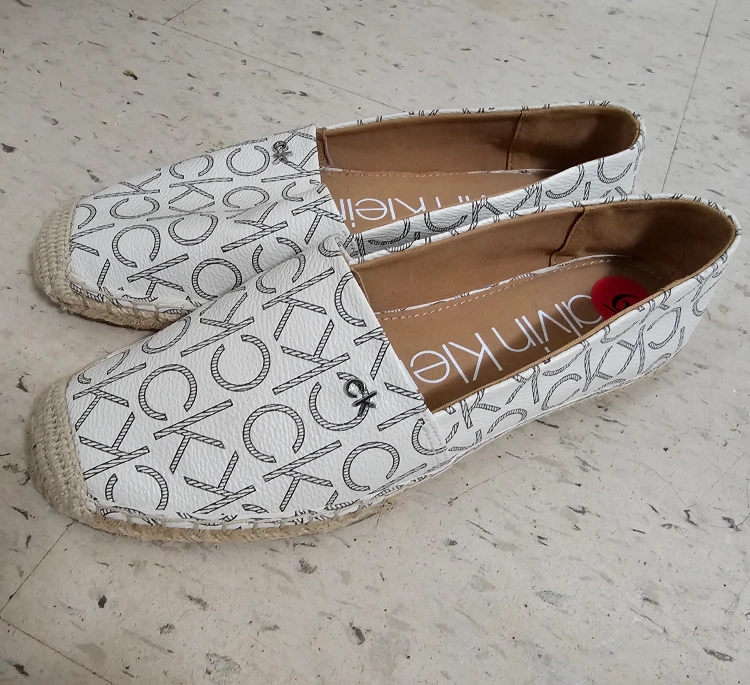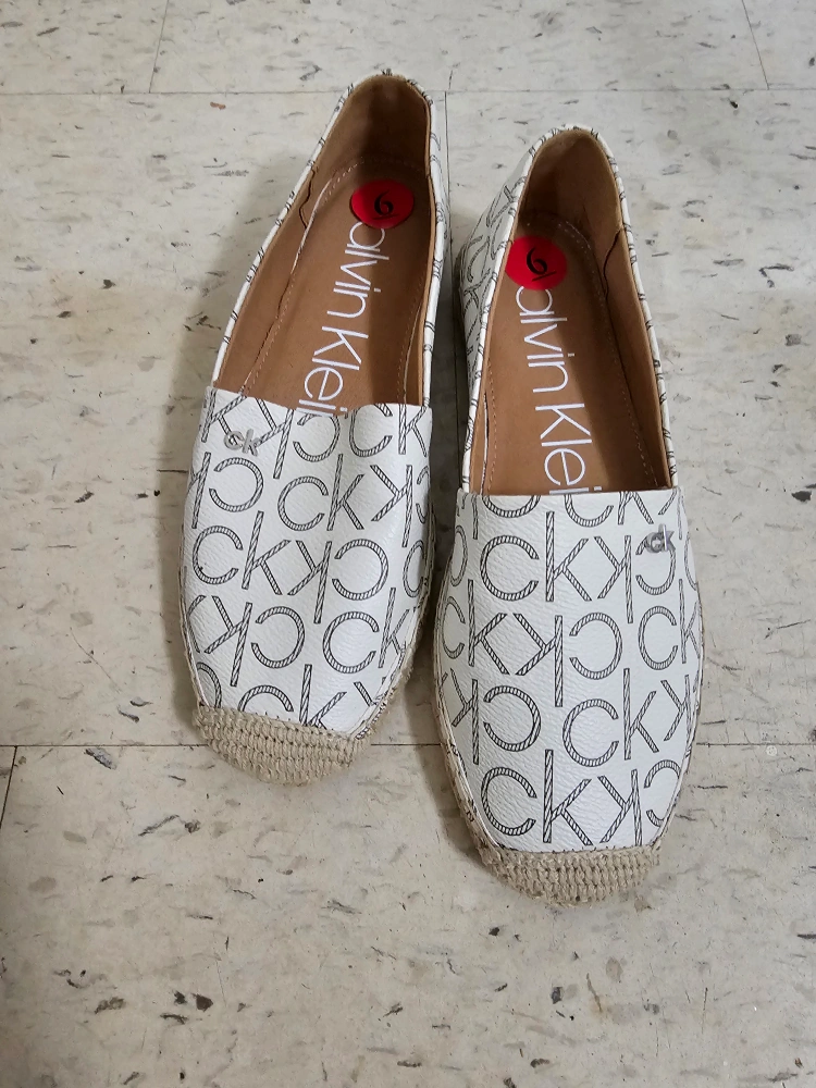 Brand new. never worn and in great condition, no any damage. Women's size 6 espadrille shoes with a white canvas upper with a black CK logo pattern. The shoes have a brown leather insole and a jute sole.