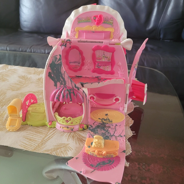 This playset includes a two-story playhouse with a removable roof and a separate play area. It comes with furniture pieces and accessories, it's in good condition but has some paint on it. I want to guv3 it for free to bring smile on a kid's face!
