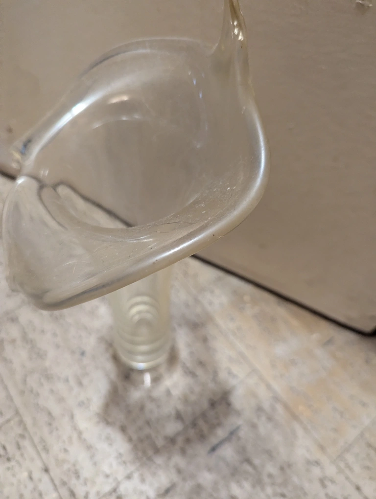 781A clear glass vase with a unique shape. It has a flared opening and a round base. It is excellent condition no cracks or chips. message if interested please.