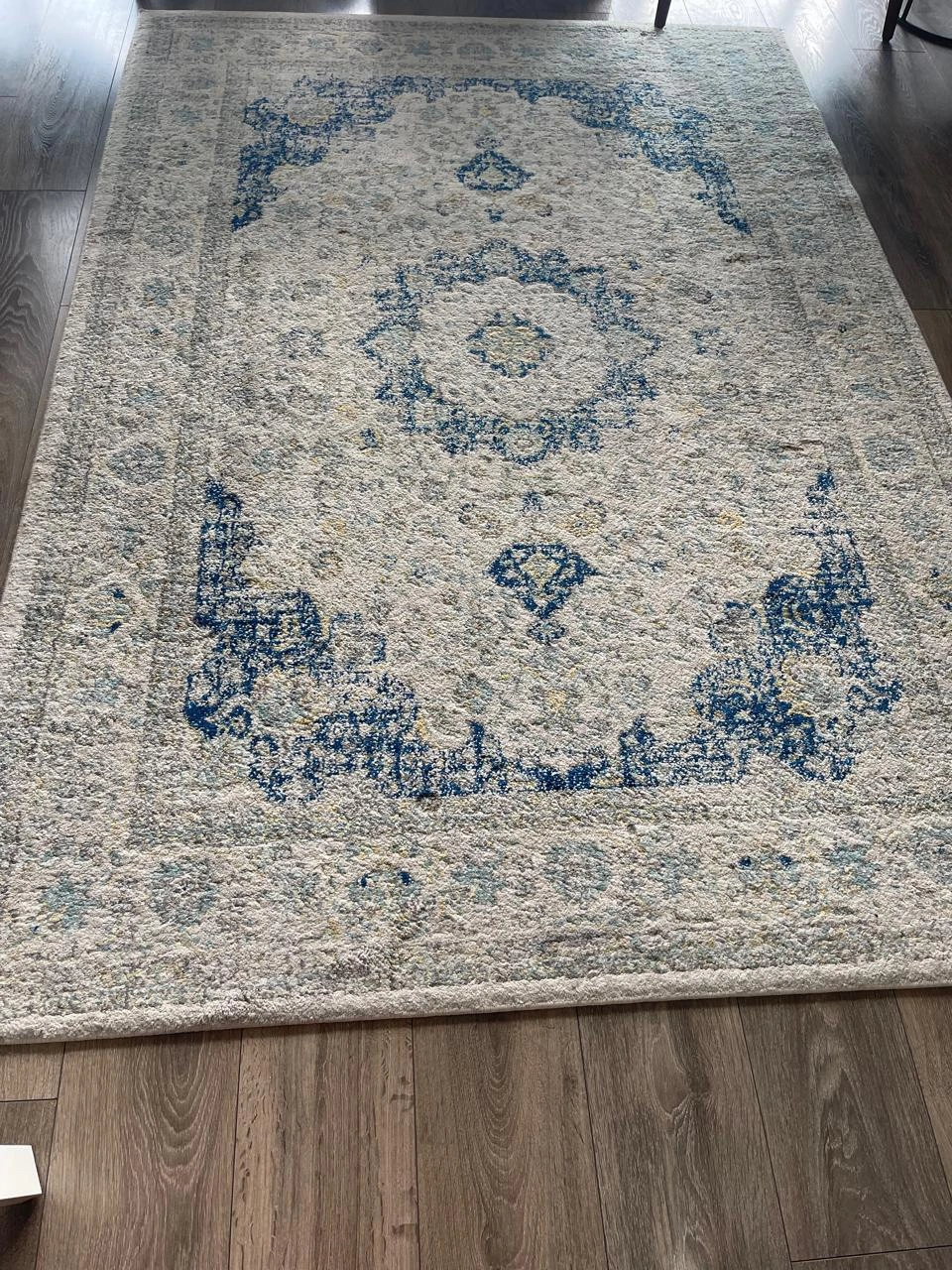 13Area rug with a blue and white pattern.