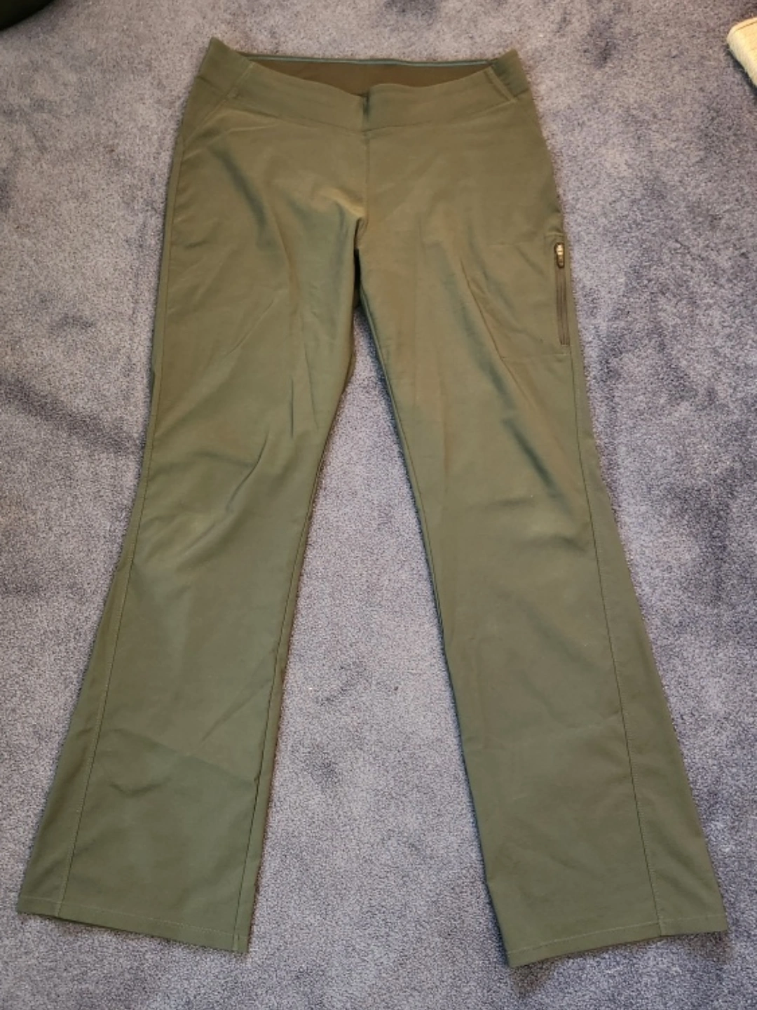 Green women's pants with a zip pocket on the left leg. Elastic waistband.