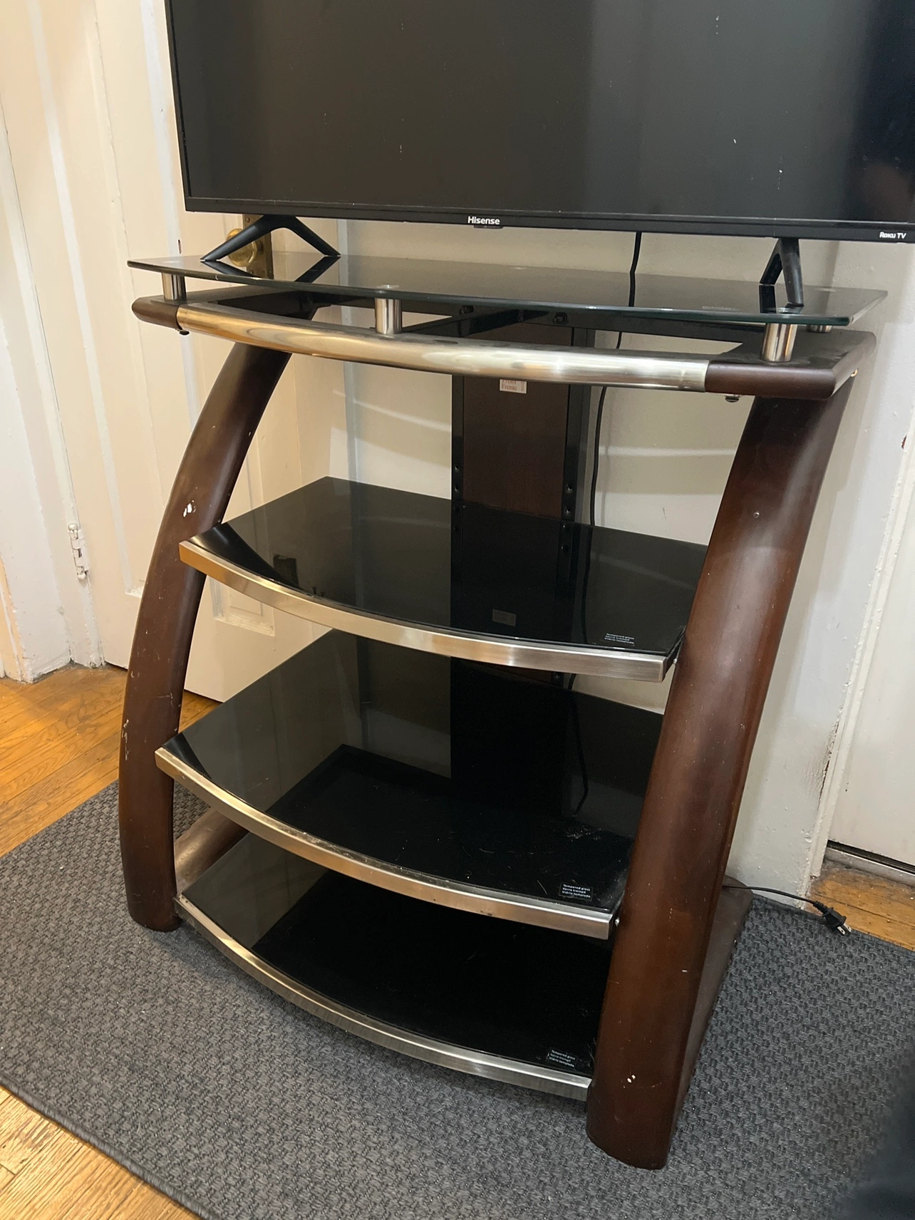 Three-shelf TV stand with tempered glass shelves and a wood frame. Has a manual repair, which is visible from certain angle. Other than that, the condition looks great. Gotta let go to give space for new furniture.