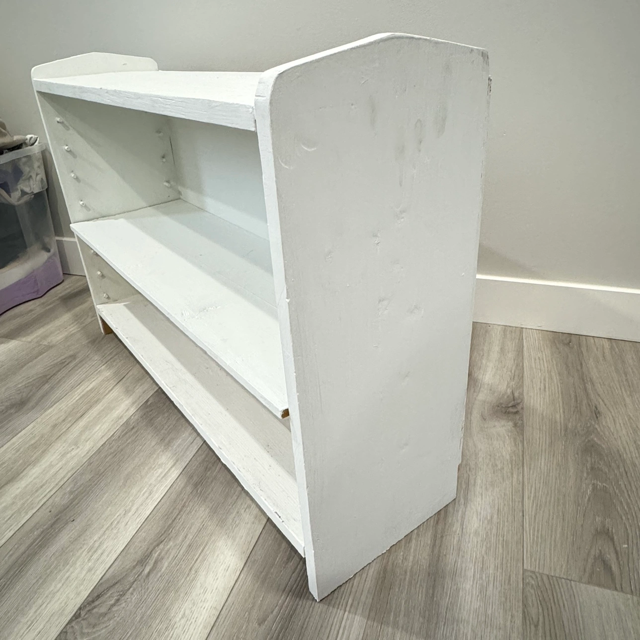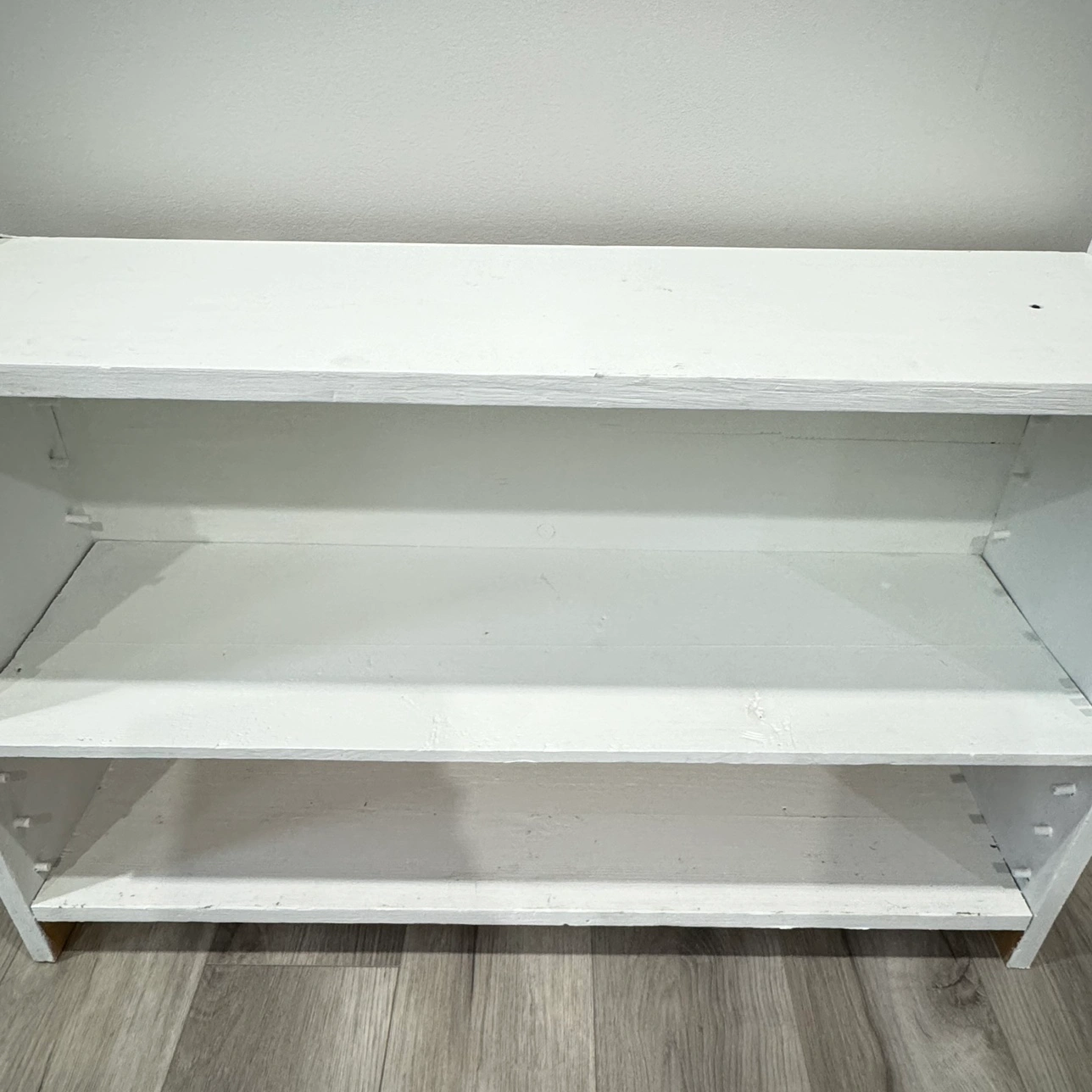 White wooden shelf with two shelves. Good for storage. Would need a little paint touch up.