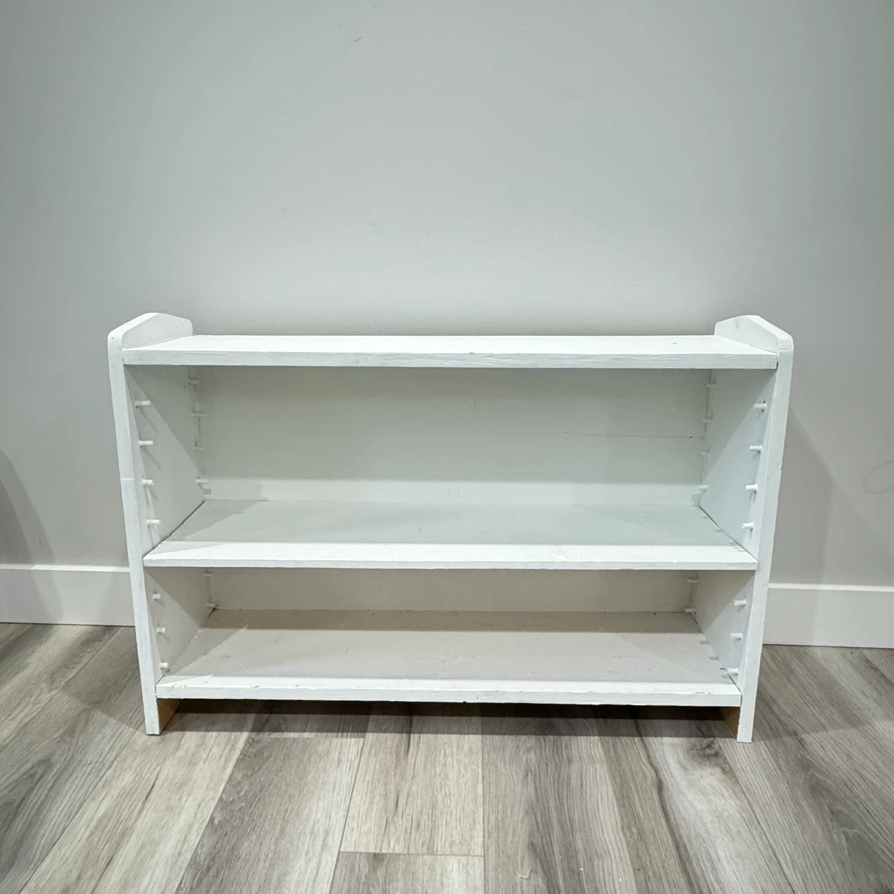 White wooden shelf with two shelves. Good for storage. Would need a little paint touch up.