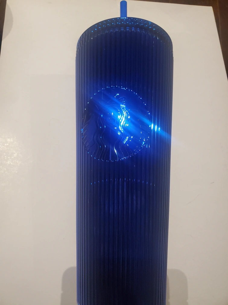 A blue Starbucks tumbler with a ribbed design and the Starbucks logo. It is made of plastic and has a reusable straw. Brand never, never used.