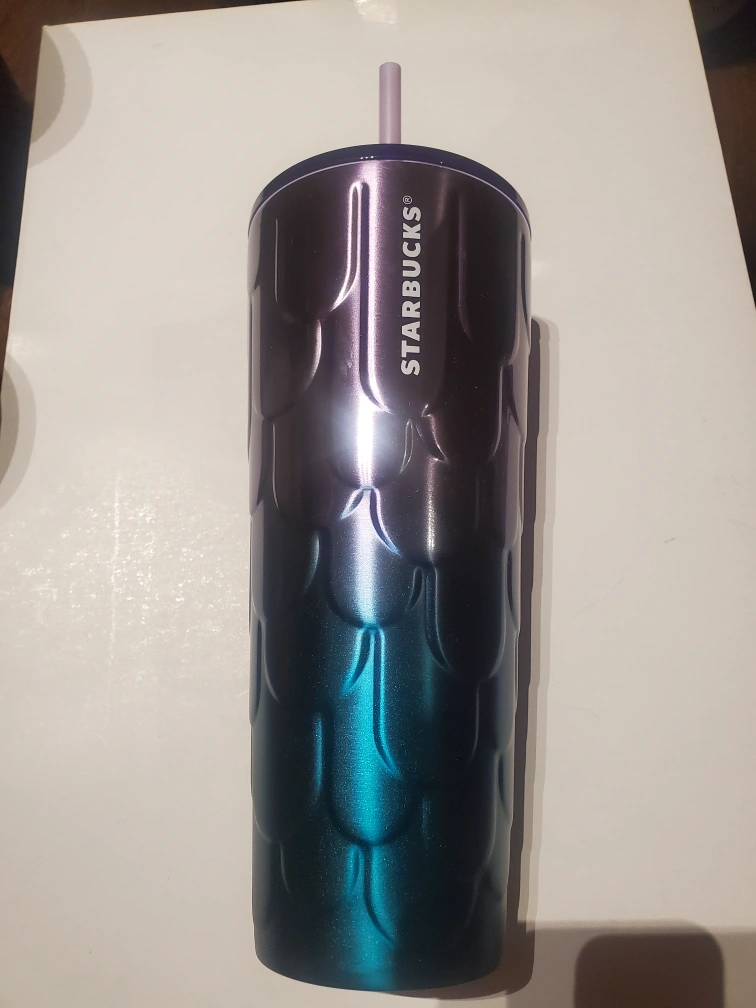 This is a Starbucks tumbler featuring a mermaid scale pattern. It has a purple to blue colour gradient. The tumbler has a lid and comes with a straw. Brand new never used.