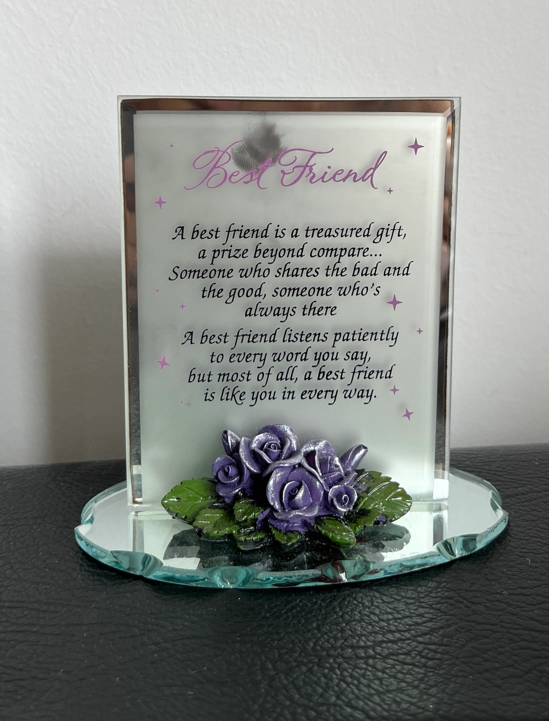 A glass figurine with a Best Friend inscription and a cluster of purple roses at the bottom.