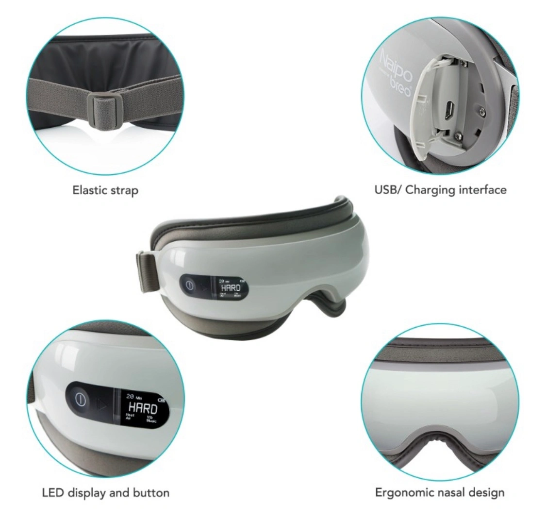 279- The eye massager helps to relax eyes through three modes - Sleep, Medium and Hard. “Sleep” mode provides a gentle massage, “Medium” mode a consoling one, and “Hard” an invigorating one. All modes go with heat. - Air compression and vibration - Rechargeable lithium battery and USB charging provide maximum portability. The tightness of the strap is adjustable.