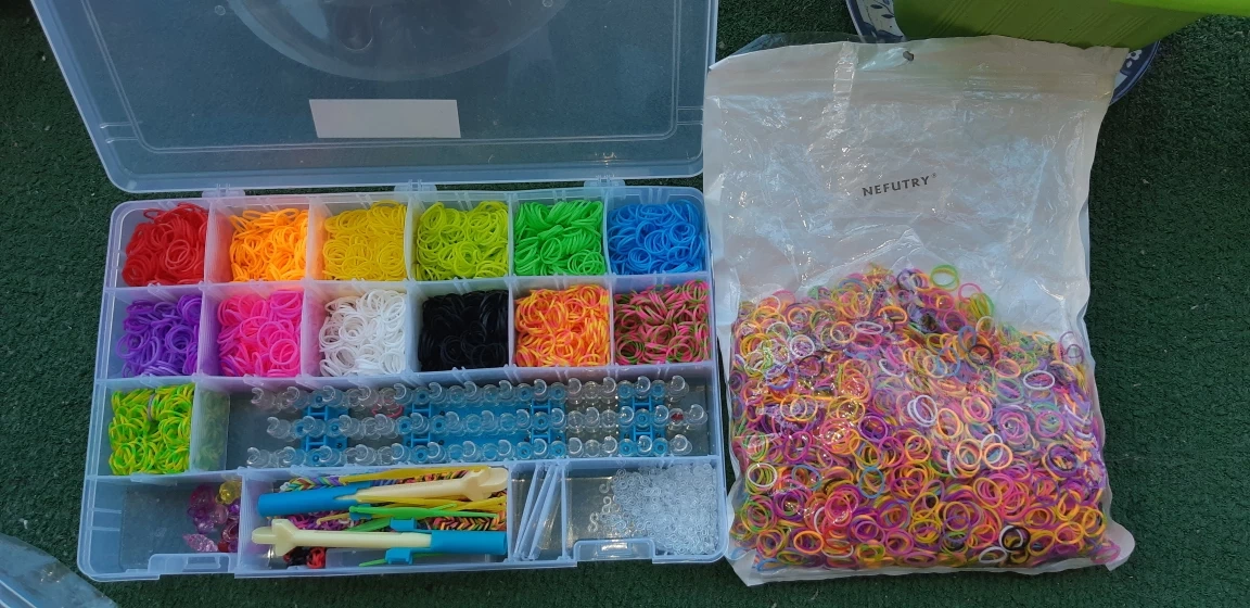 A variety of colours, sizes, and tools for making rubber band bracelets and other crafts. Includes a clear storage case, a large bag of assorted coloured bands, and a hook As well as a large bag of over a thousand additional bands