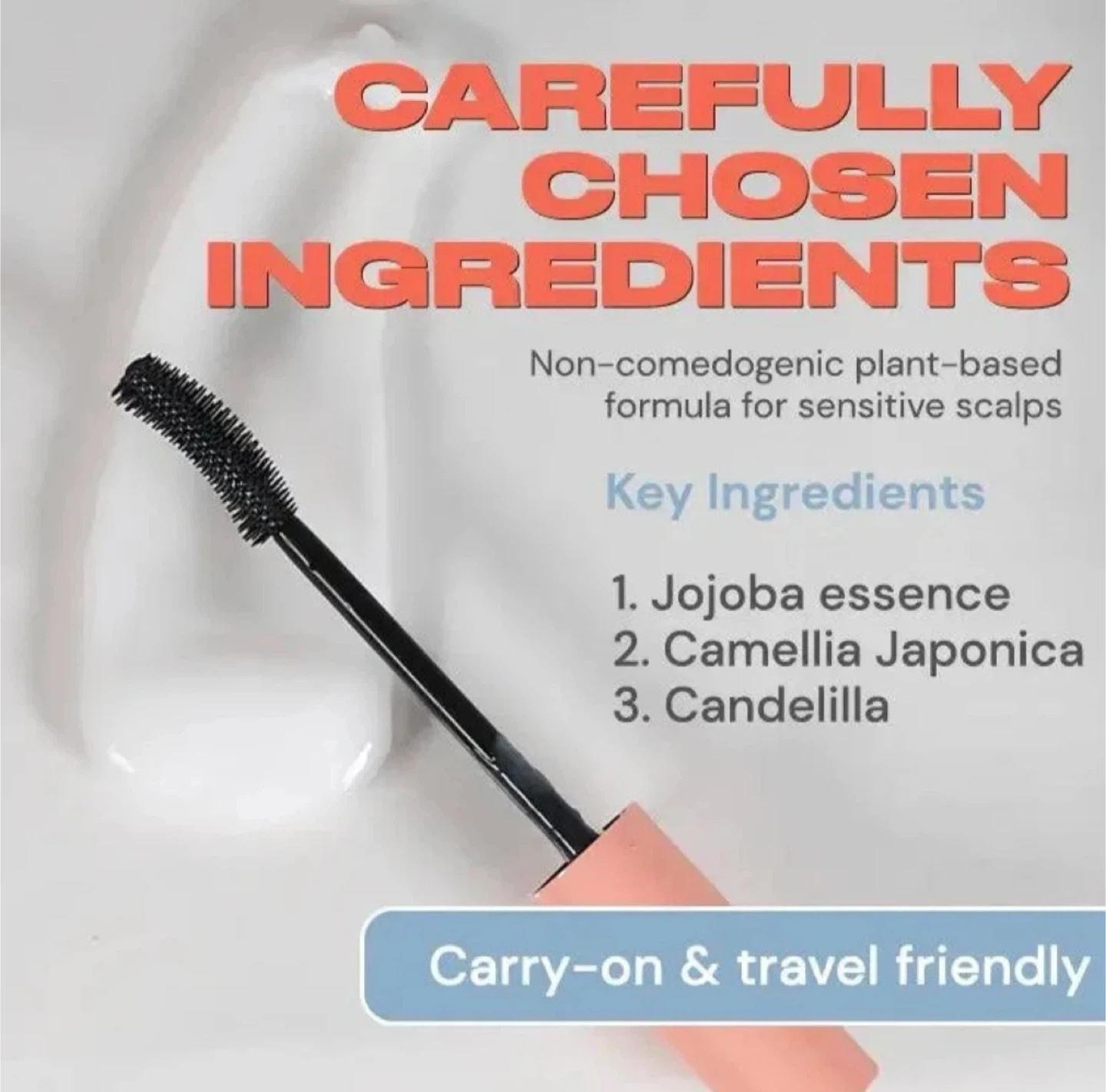 The travel sized hair mascara tube with convenient hair finishing stick can be carried with you for lightning fast touch ups– it even works to sculpt eyebrows or beards! (do not use as eye mascara)