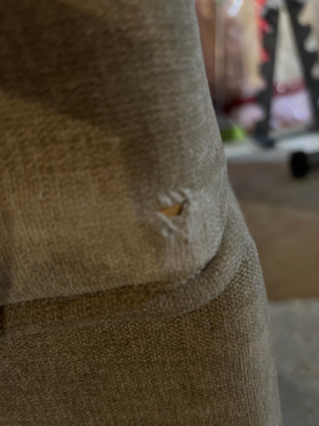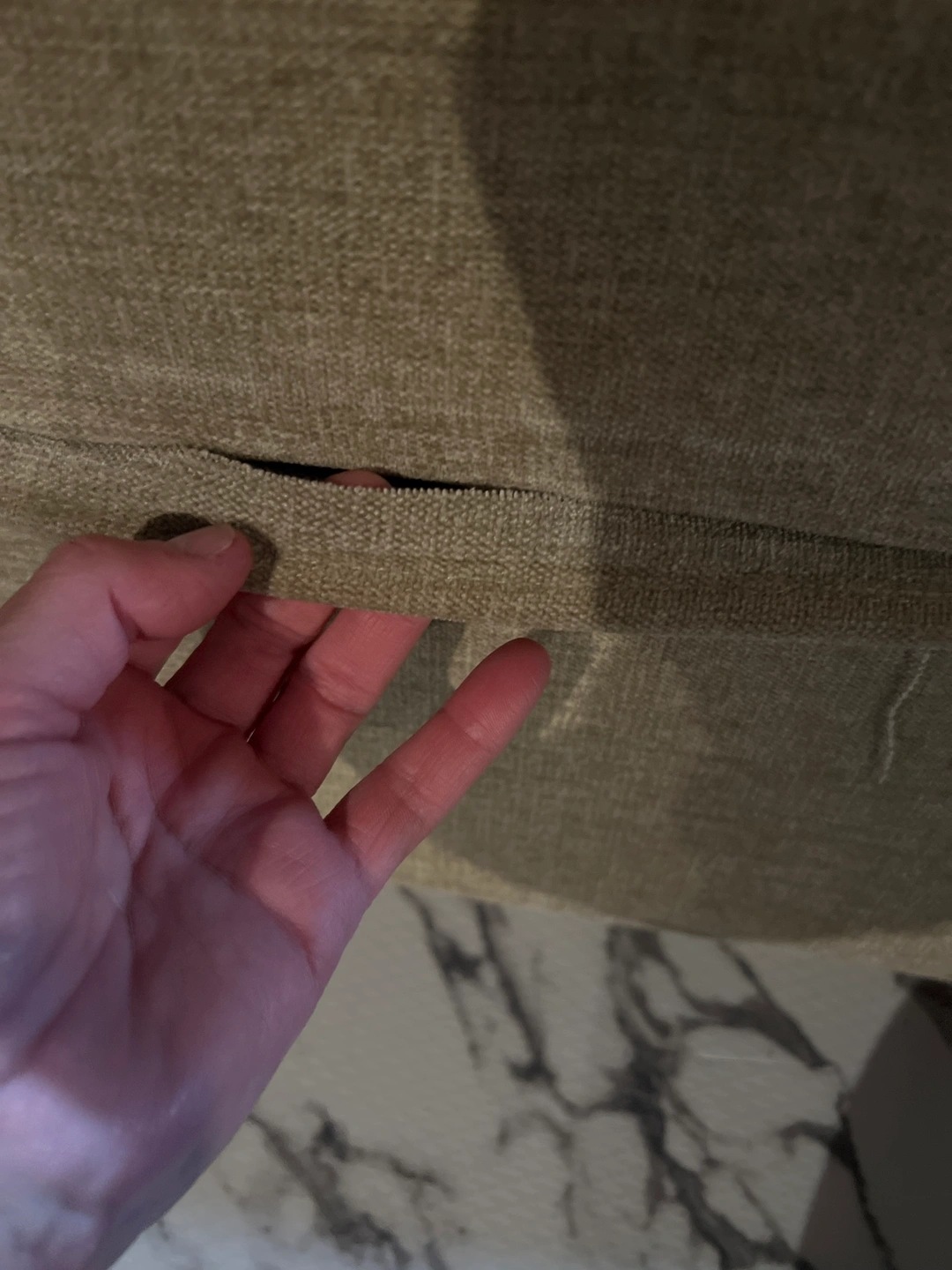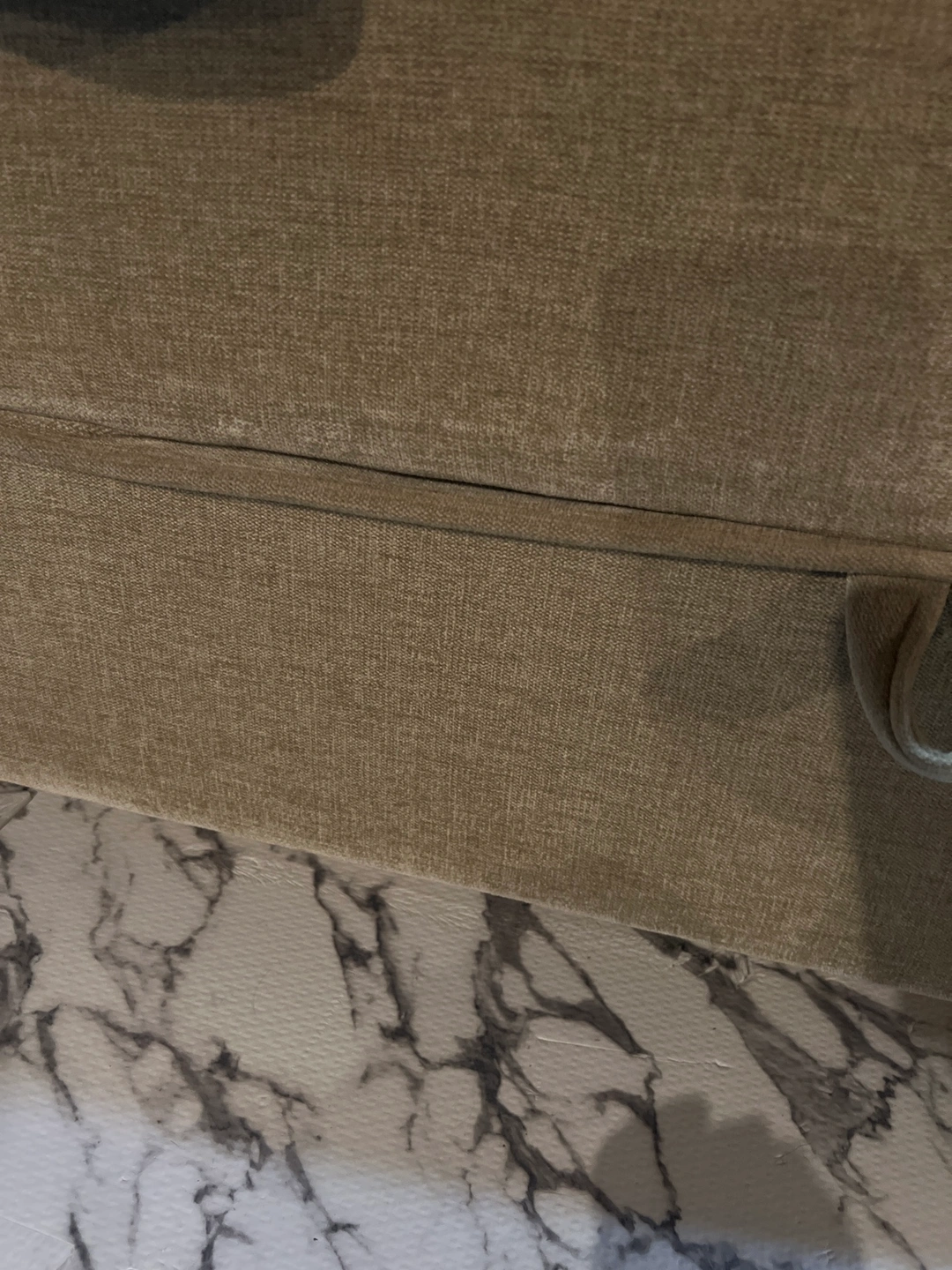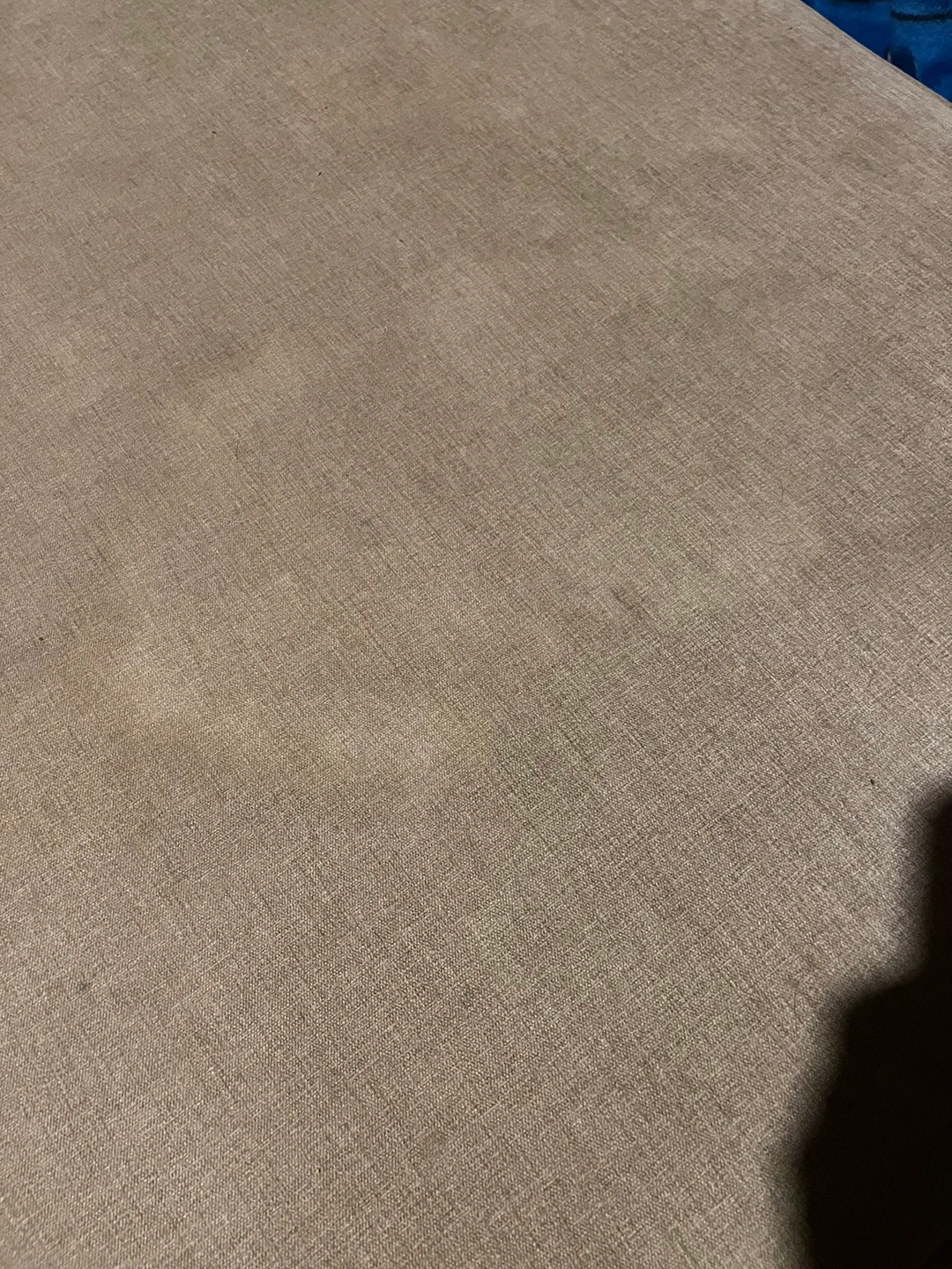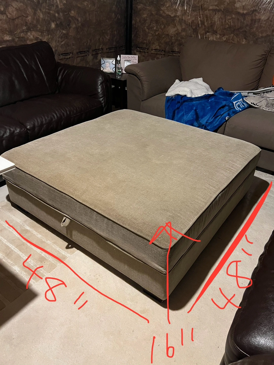 Large storage ottoman with a cushioned top. Perfect for extra seating or storage. A few areas with imperfections (none are very noticeable) and shown in pics. One is a worn hole on one of the sides, one is remnants of spills on top surface that were steam cleaned and the other is the piping that has come unstitched from the top lid portion in a few spots along the handle lifting side. It’s only seen when you pull it away. This was custom made at Urban Barn.
