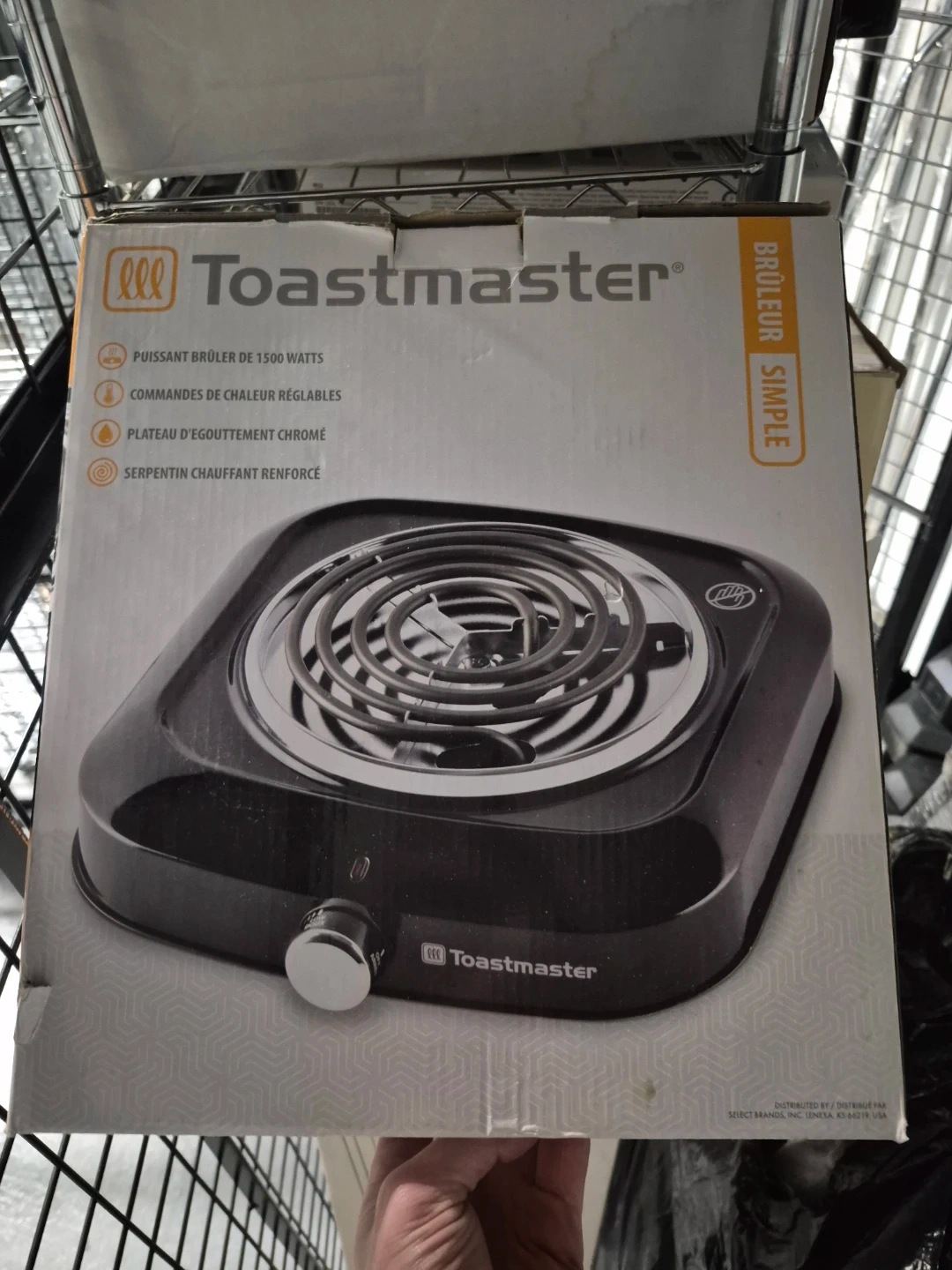 This is a Toastmaster single burner hot plate. It features a powerful 1500 watt heating element with adjustable temperature controls. The drip tray is chrome plated and it has a reinforced heating coil.