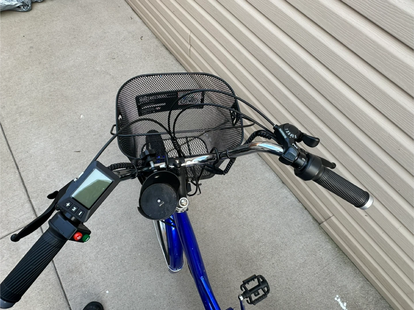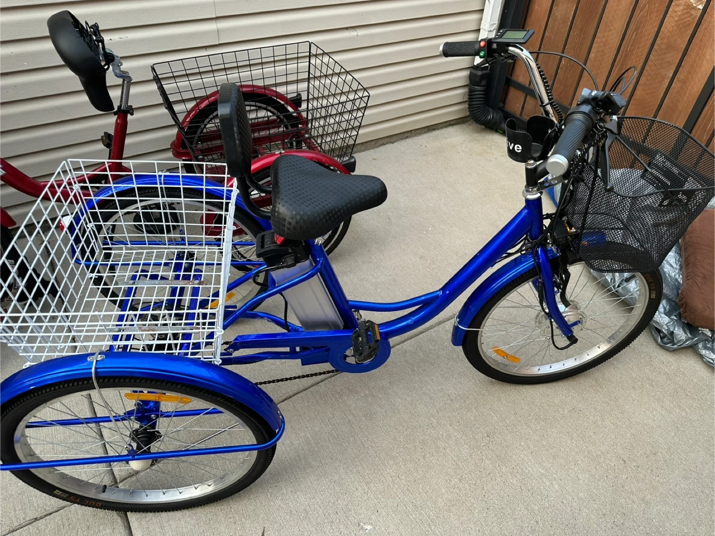 This is a blue electric tricycle with a large basket on the back and a smaller one on the front. It has a comfortable seat and handlebars with controls. It's great for carrying groceries or for leisurely rides. The frame is blue and the seat is black.