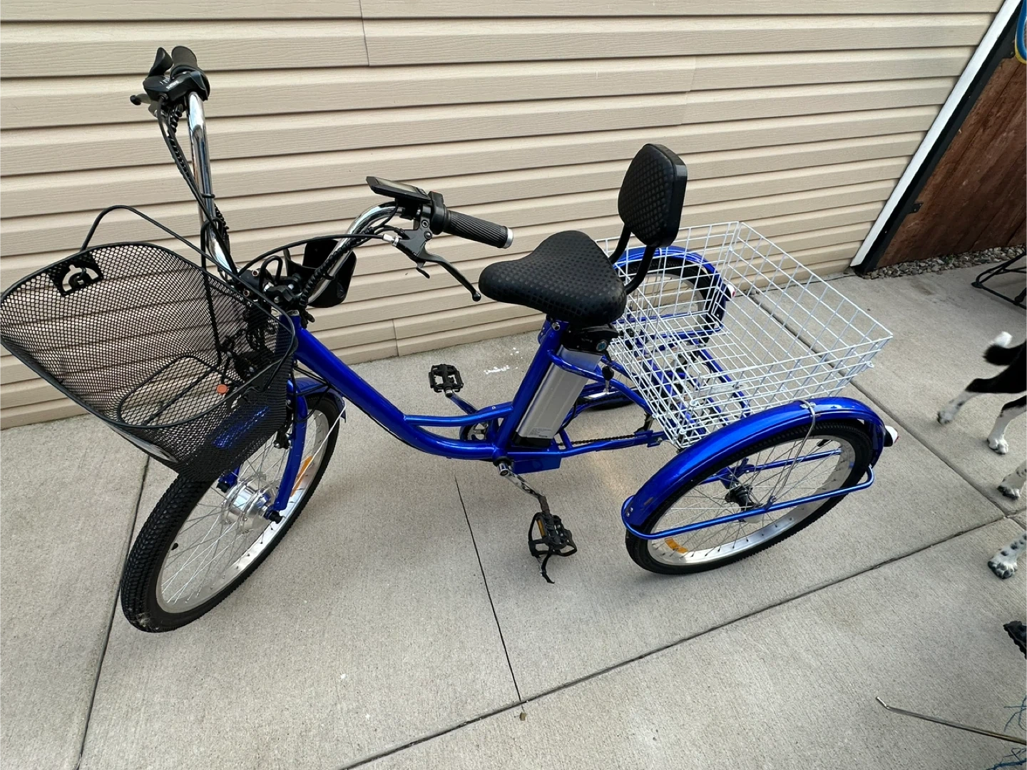 This is a blue electric tricycle with a large basket on the back and a smaller one on the front. It has a comfortable seat and handlebars with controls. It's great for carrying groceries or for leisurely rides. The frame is blue and the seat is black.