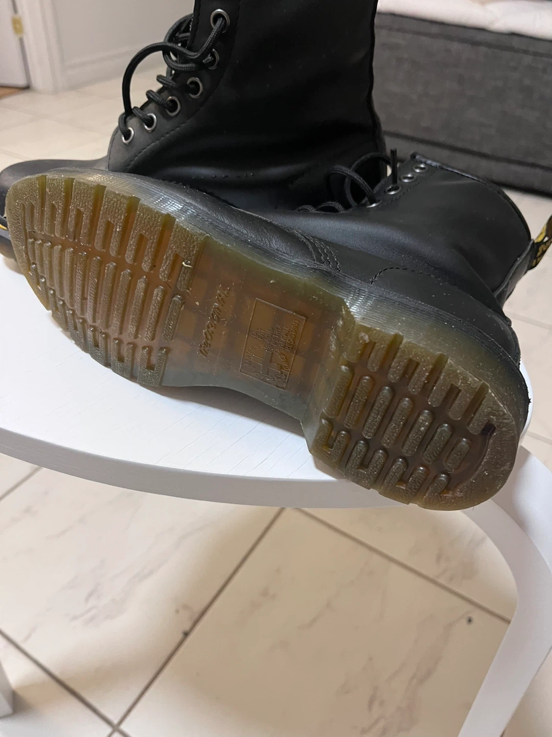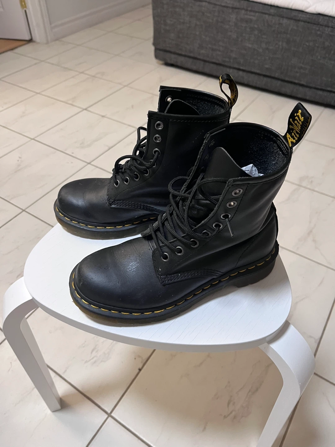 Classic Dr. Martens 1460 boots in black leather. Features the iconic yellow stitching and AirWair sole. Durable and stylish footwear. Great for everyday wear!