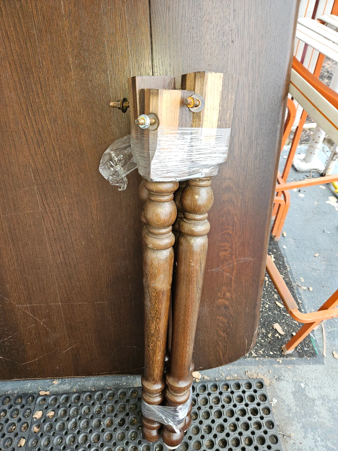 A dark wood dining table with a drop-leaf design. It comes with four detachable, turned wooden legs that are wrapped for transport. The table surface shows some signs of wear.