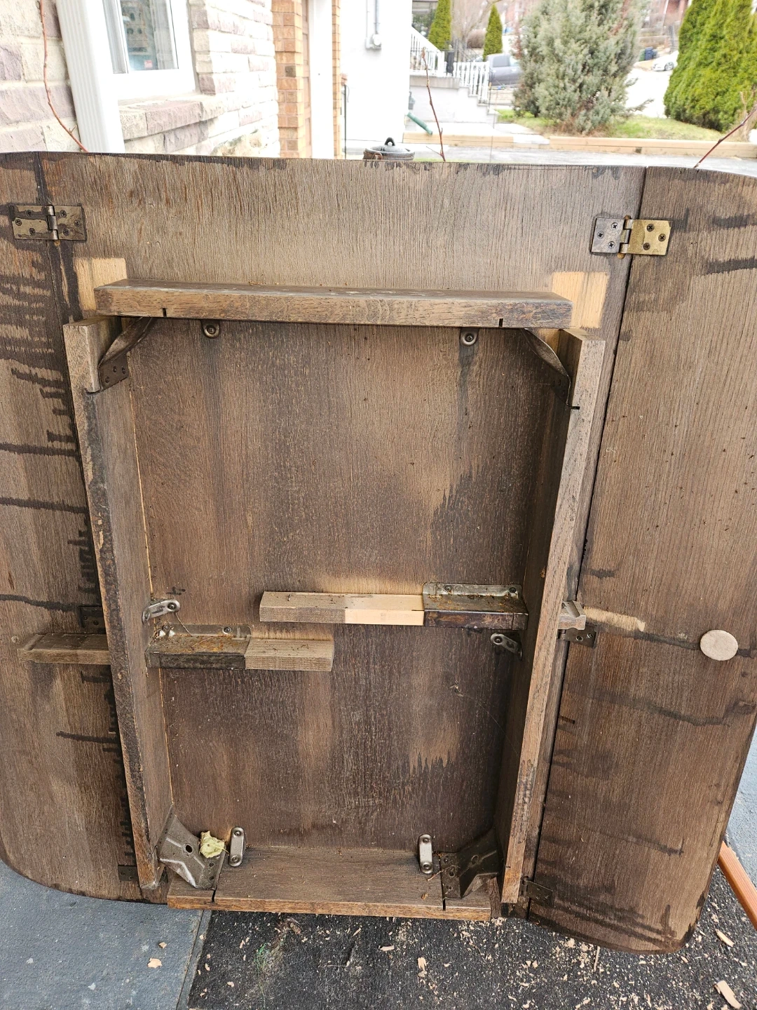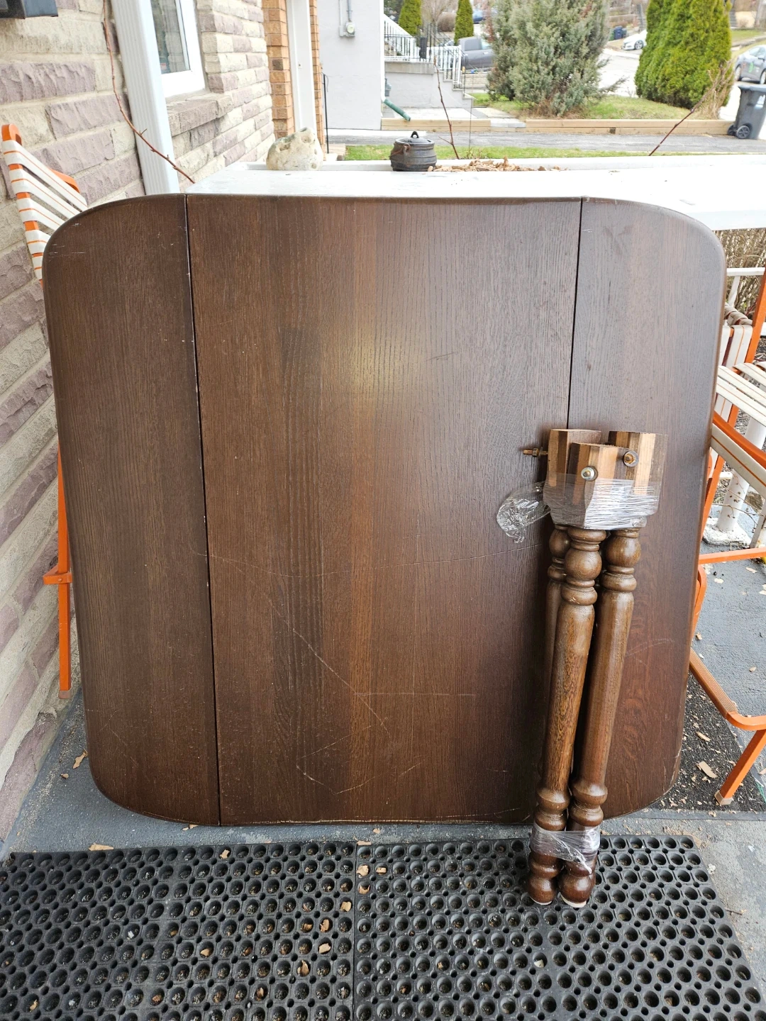 A dark wood dining table with a drop-leaf design. It comes with four detachable, turned wooden legs that are wrapped for transport. The table surface shows some signs of wear.