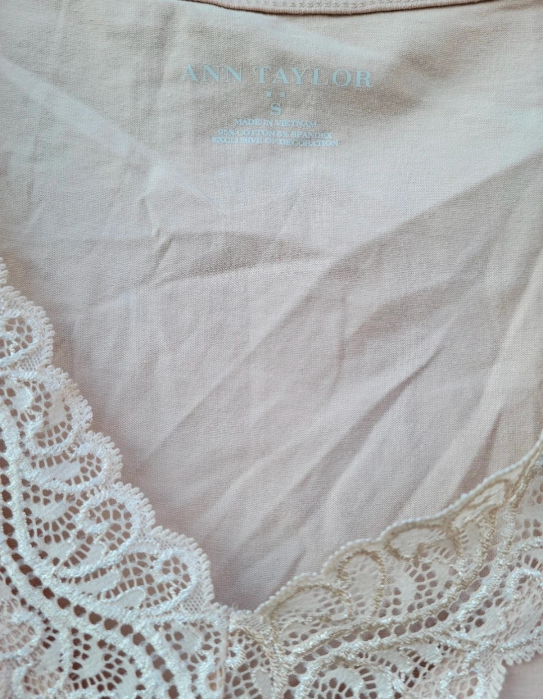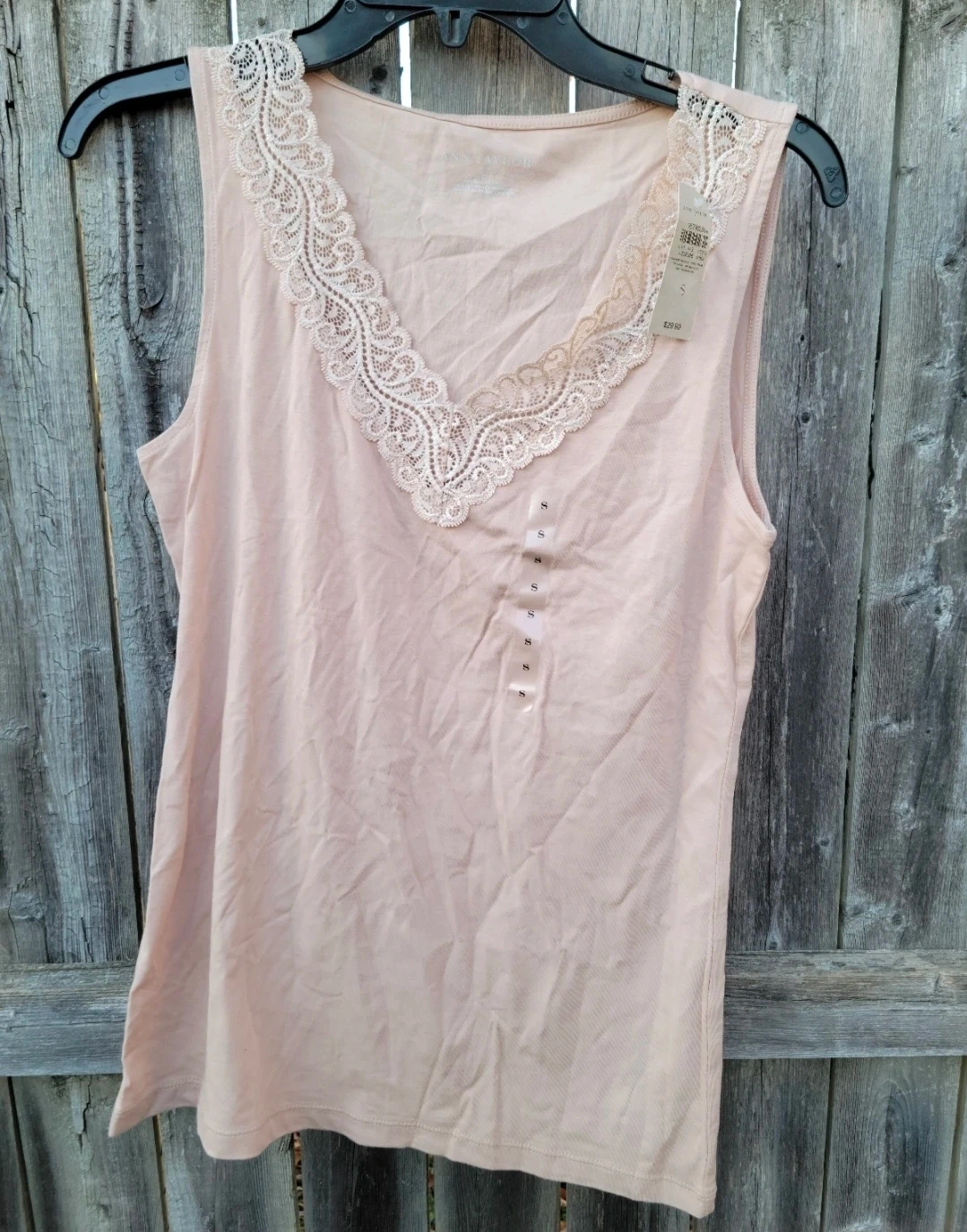 This is an Ann Taylor women's tank top. It features a delicate lace trim along the V-neckline. The material is 95% cotton and 5% spandex for a comfortable fit. Size is small.