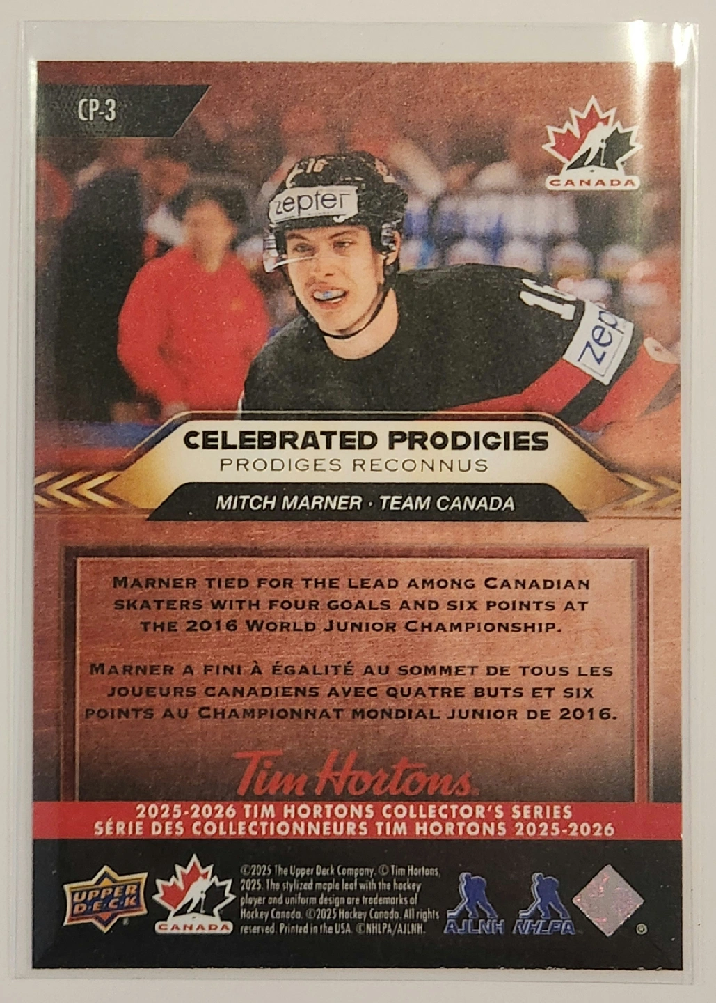 Mitch Marner "Celebrated Prodigies" insert - Tim Hortons collector's series hockey cards Team Canada 2026 Olympics. Mint.