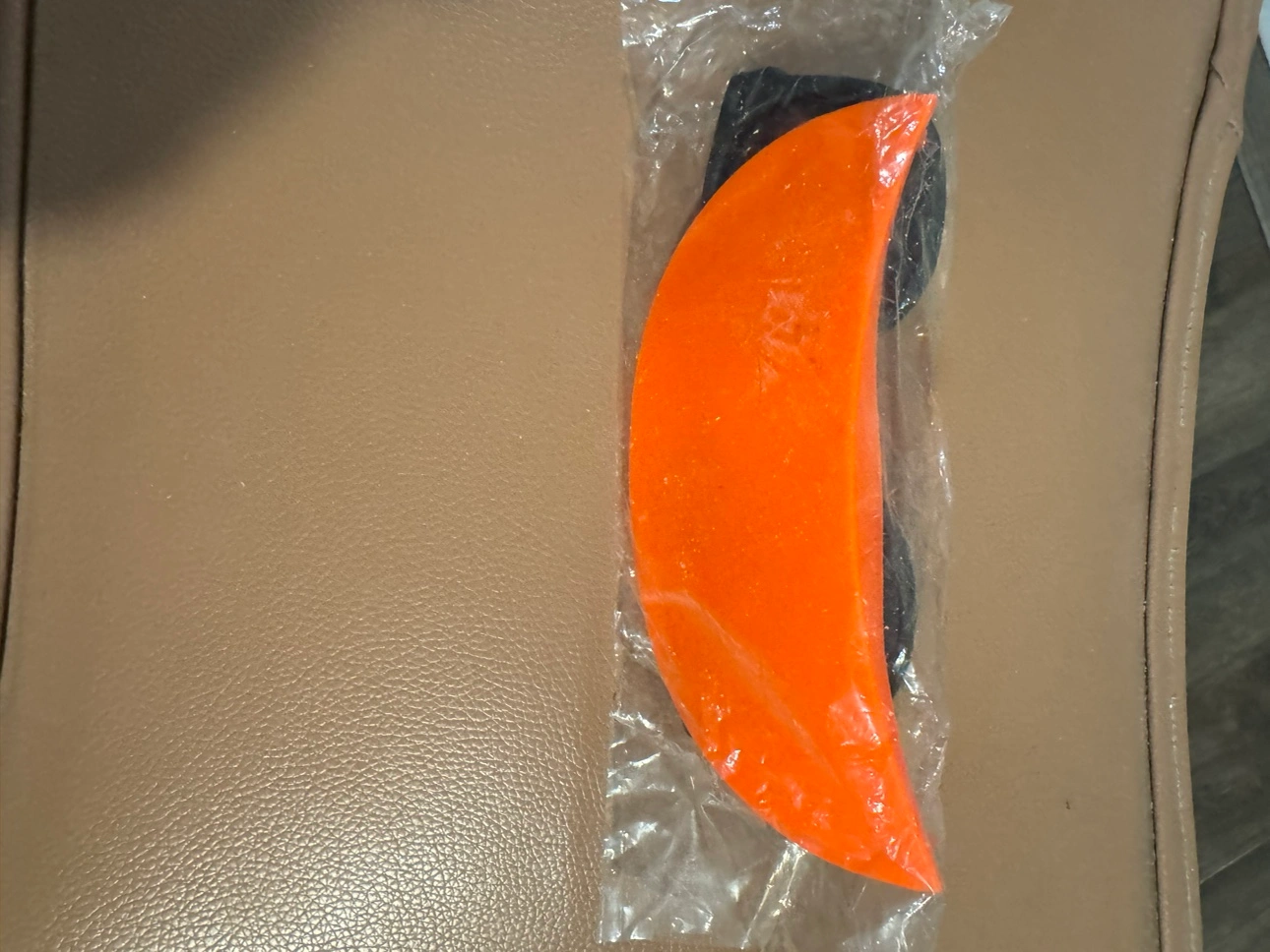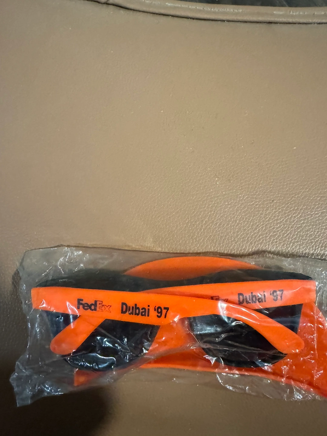 These are vintage sunglasses with an orange frame and black lenses. The sunglasses come in a clear plastic bag with a black elastic headband. The sunglasses are branded with the FedEx logo and say "Dubai '97" on the arms.