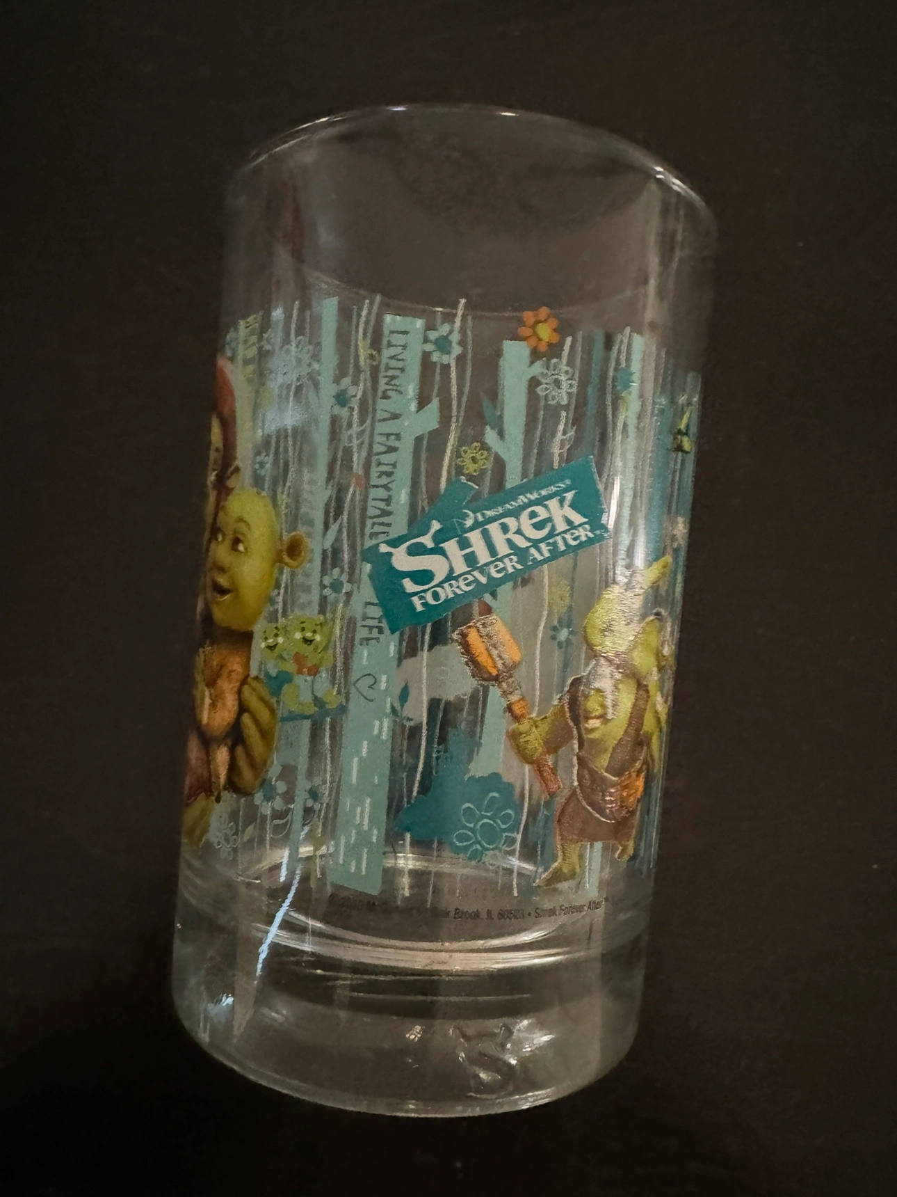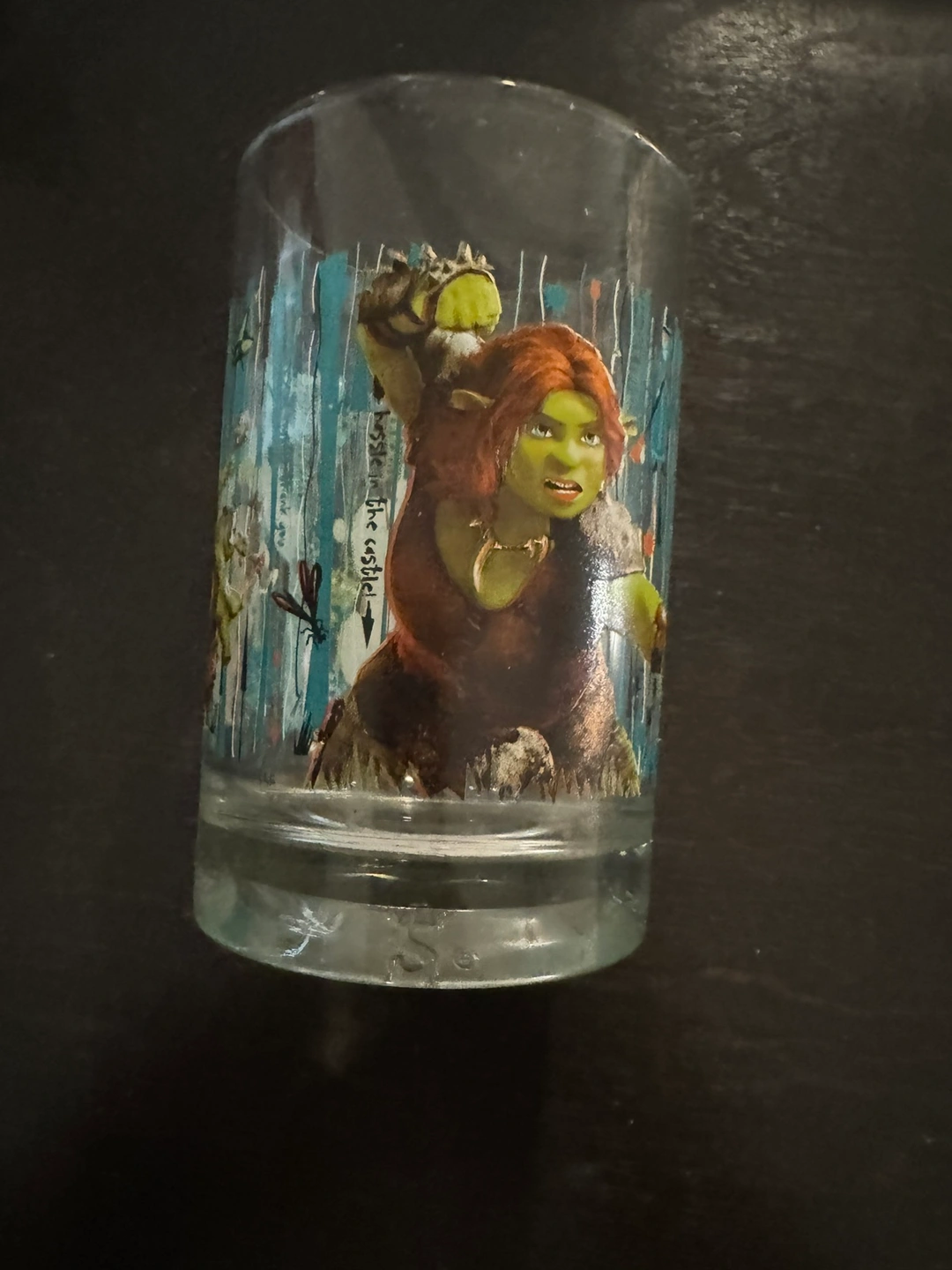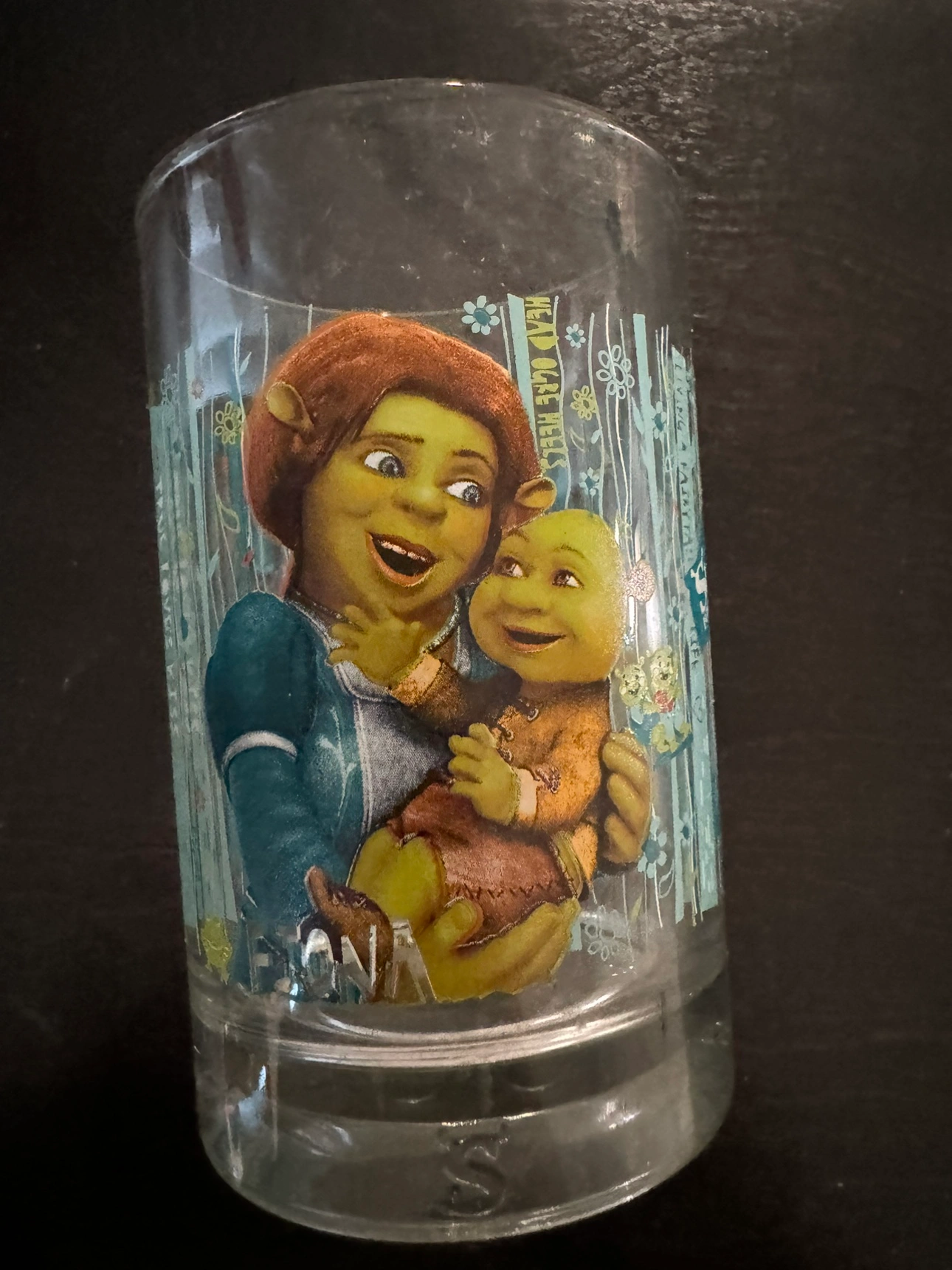 A glass featuring Shrek and Fiona from the movie Shrek Forever After. It is approximately 4 inches tall.Pick up in Oakville.