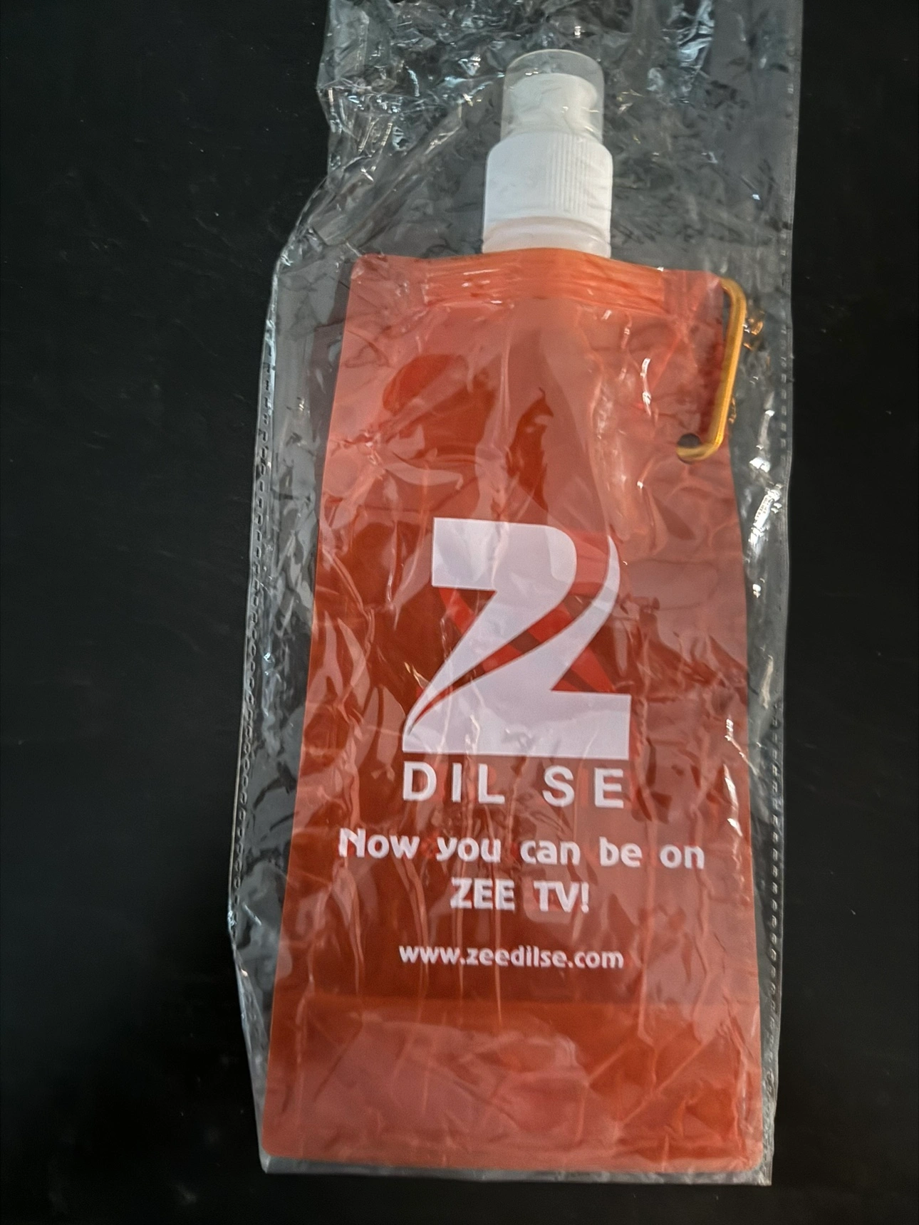 Collapsible water bottle with a white Zee TV logo and red background. It has a white cap with a black ring. The bottle is sealed in a clear plastic bag.Pick up in Oakville.