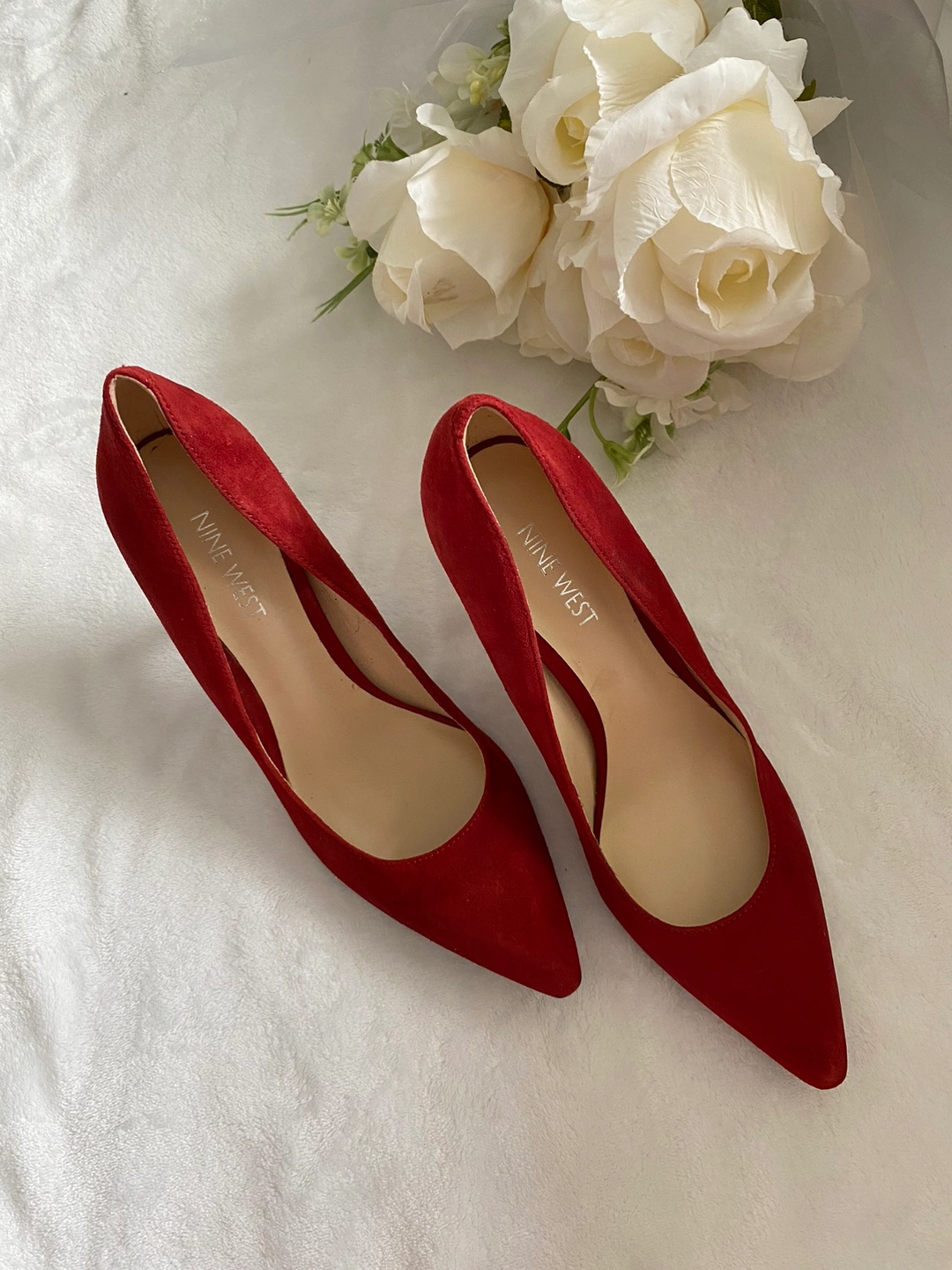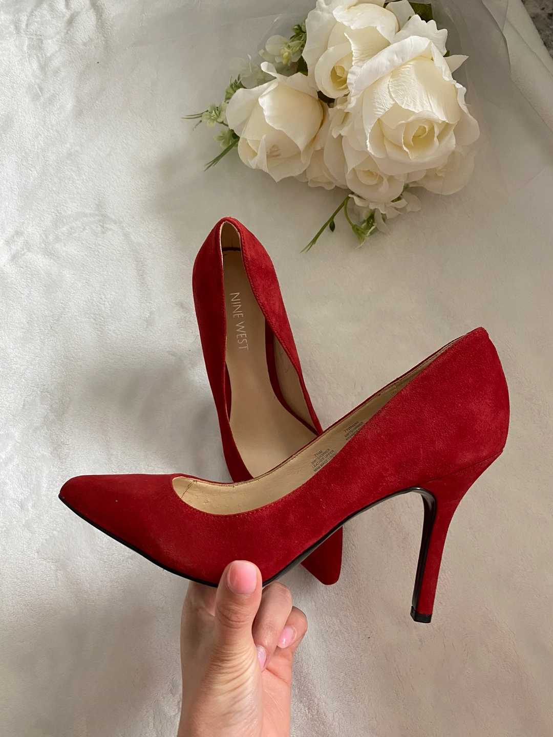 Red suede heels. Size 7.5. Heel height is approximately 3.5 inches. They are in a classic pointed toe style. They are perfect for any special occasion.