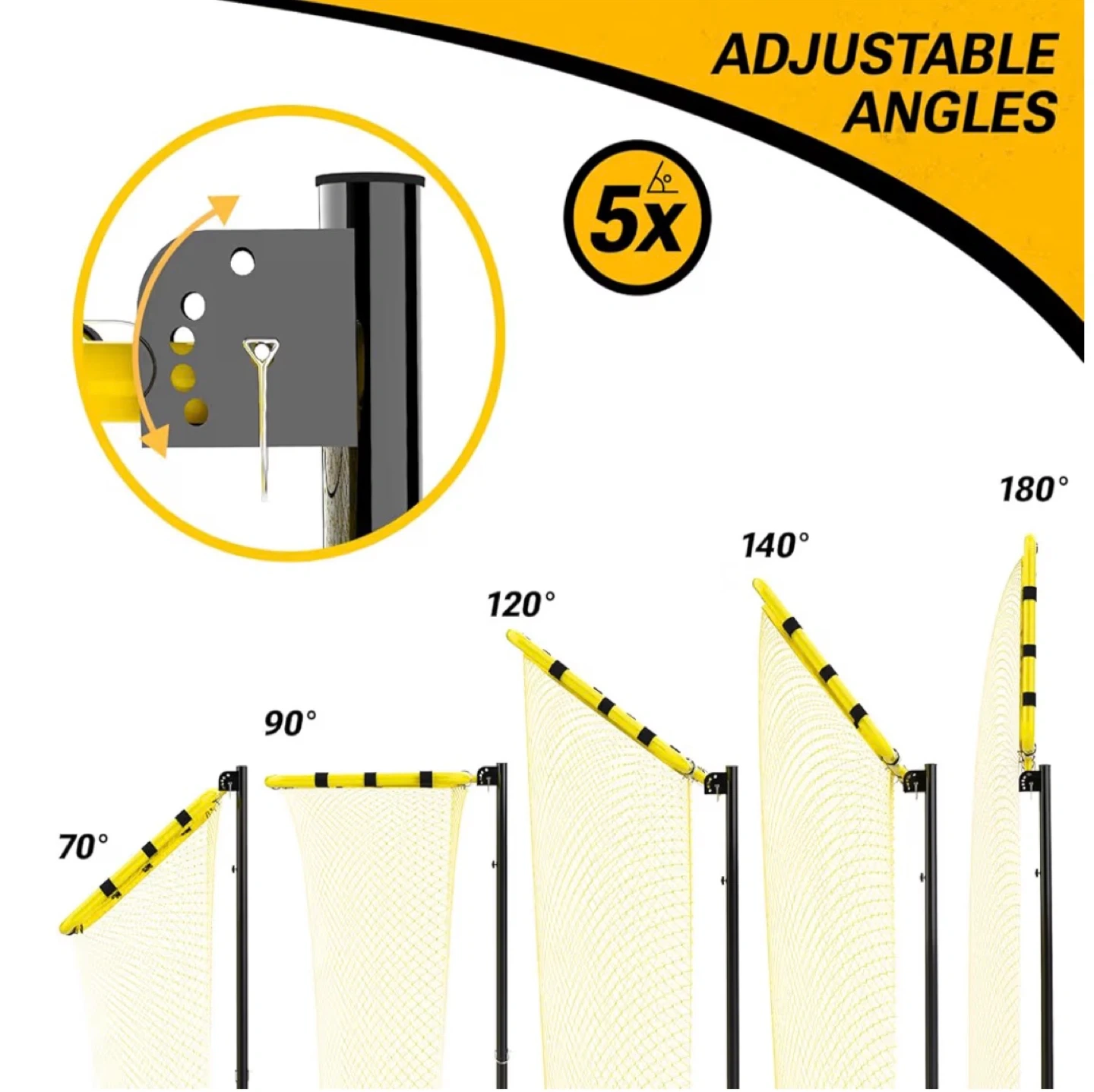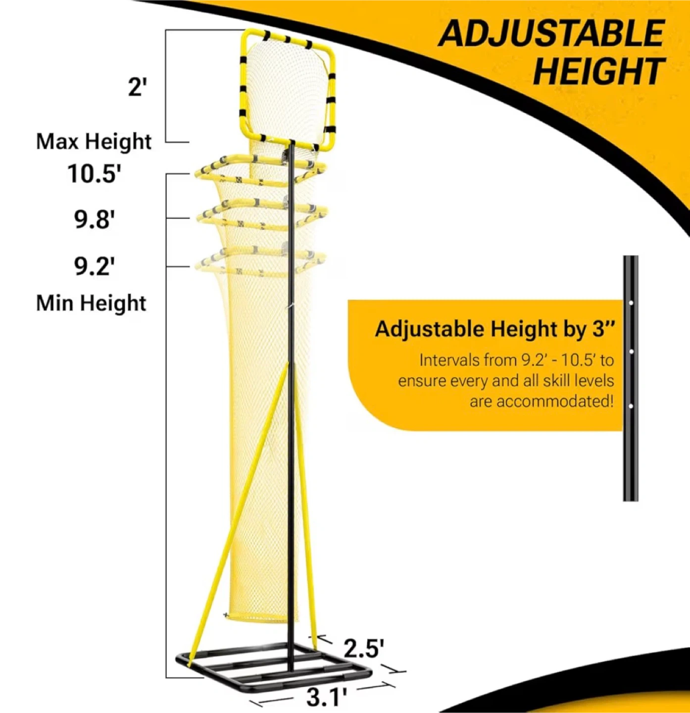 Dimples Excel 10.5FT adjustable volleyball setter training net with 3 height levels and 5 angles (70 - 180 degrees).
