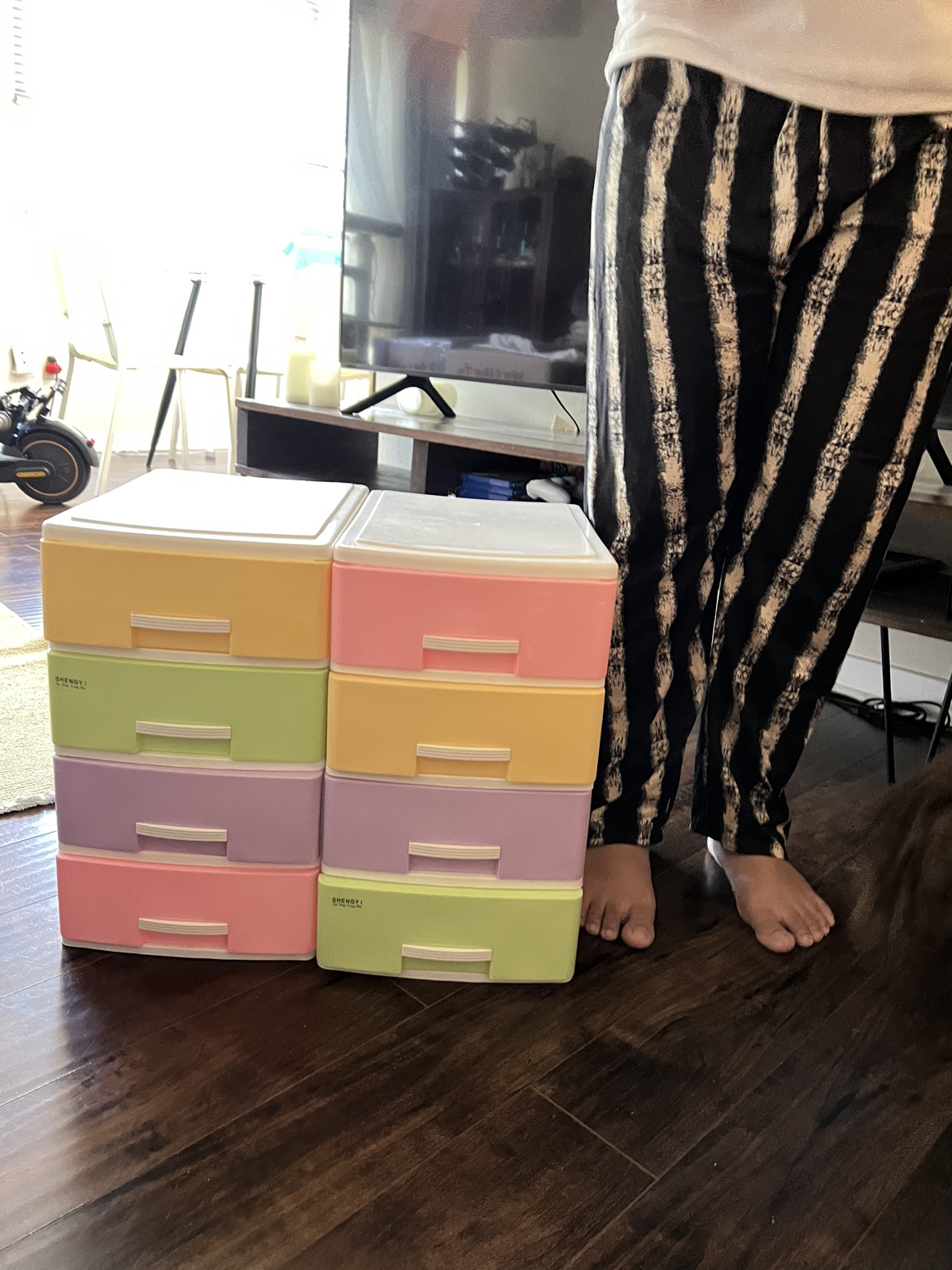 Two sets of four-drawer organizers in pastel colours. They are a great way to organize any space.