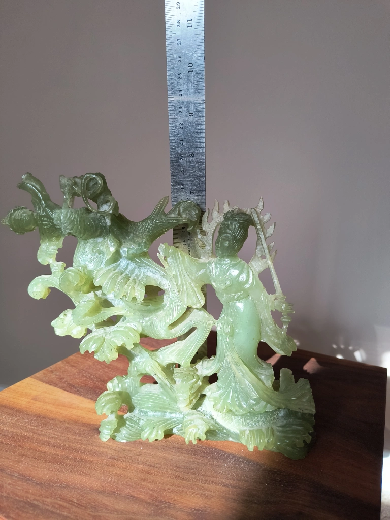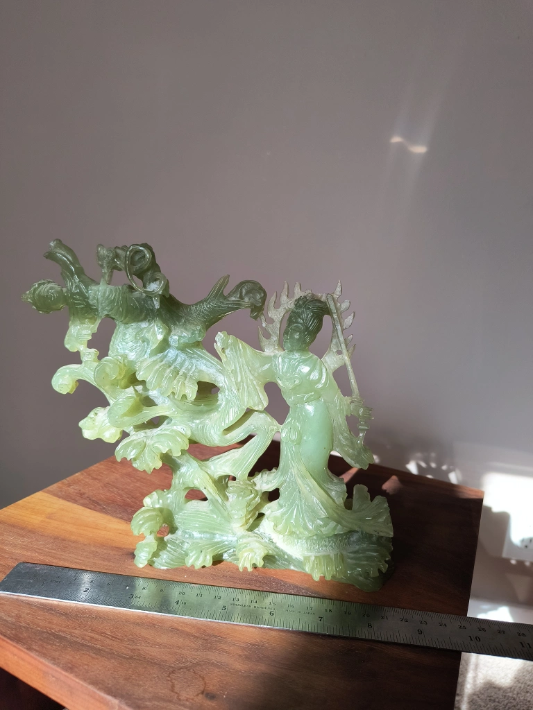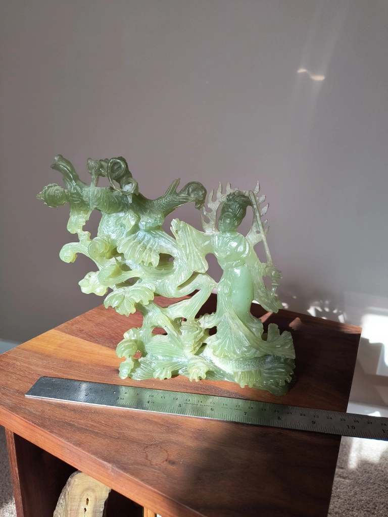 jade sculpture of a woman and fish.