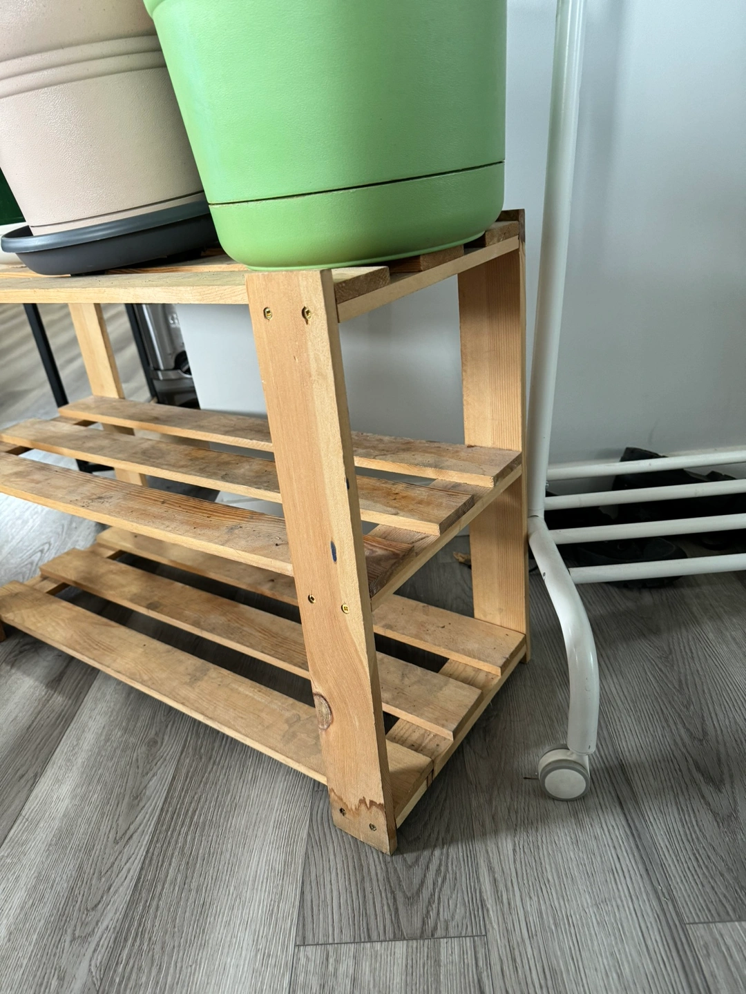 This is a 3-shelf wooden unit. It is made of unfinished wood. It is approximately 2 feet tall and 1.5 feet wide. It is perfect for storage in an entryway or bedroom.