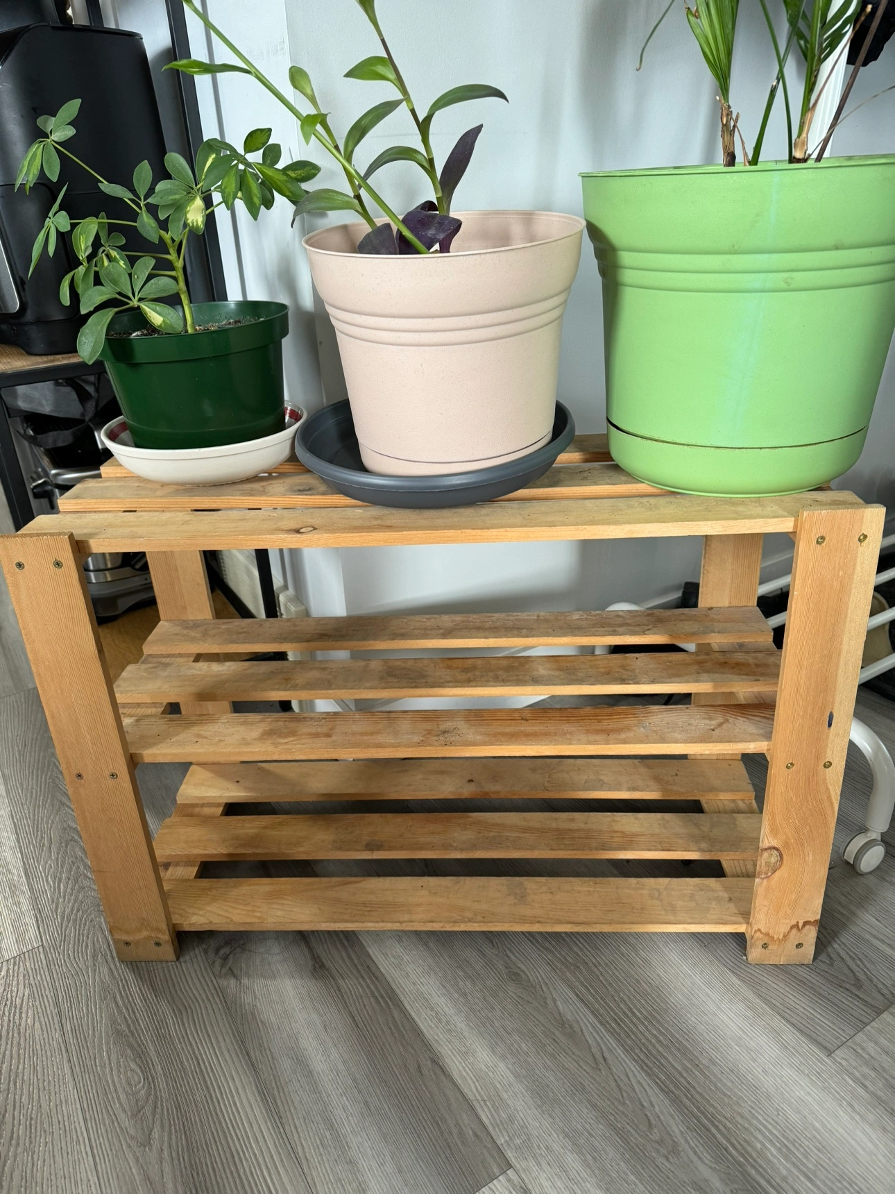 This is a 3-shelf wooden unit. It is made of unfinished wood. It is approximately 2 feet tall and 1.5 feet wide. It is perfect for storage in an entryway or bedroom.