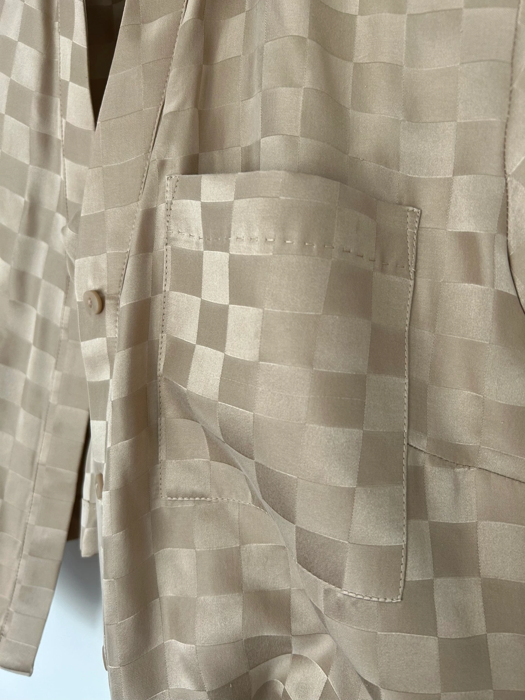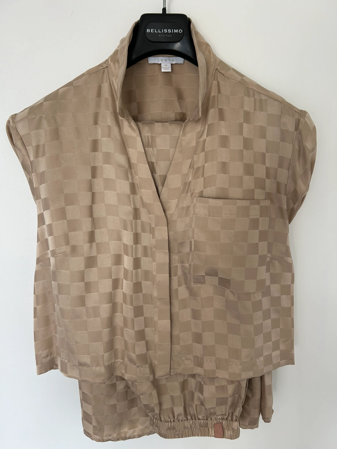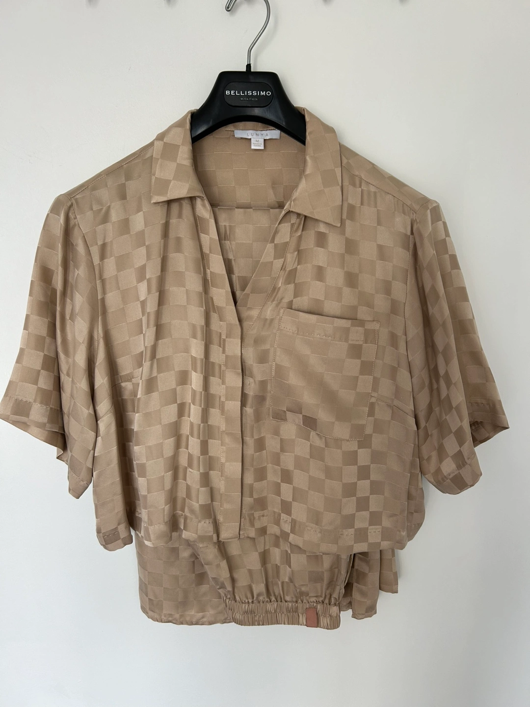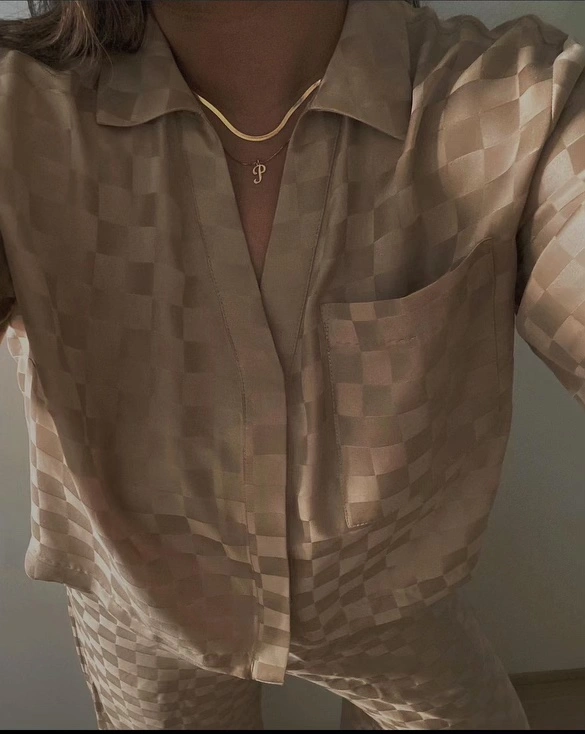 Size small - beige checkered pattern 100% silk - brand new with tags - worn once for photos. Machine washable!!!! Cash and pick-up only, thanks!