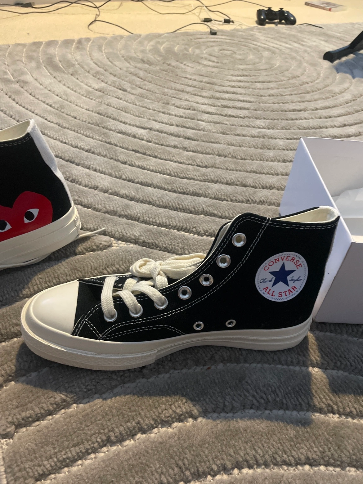 Black Converse Play Comme des Garçons Chuck Taylor High Tops in size 9.5 US. These shoes come in the original box.