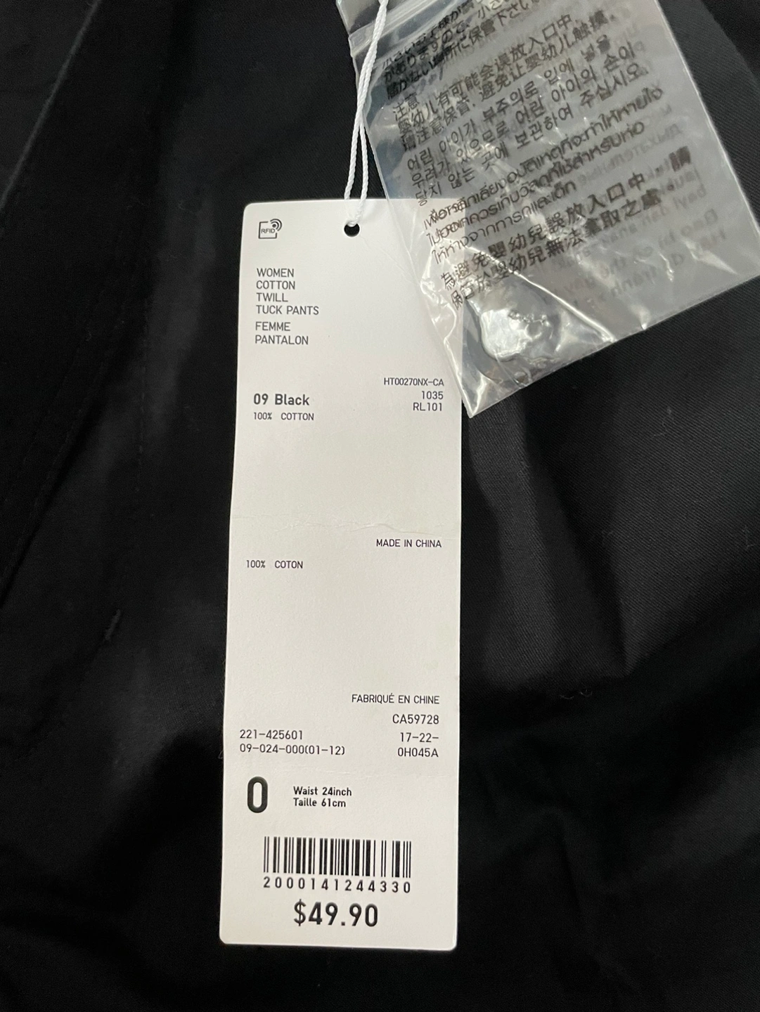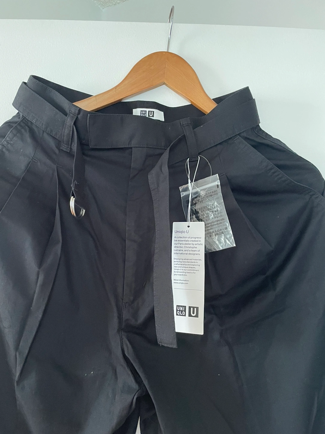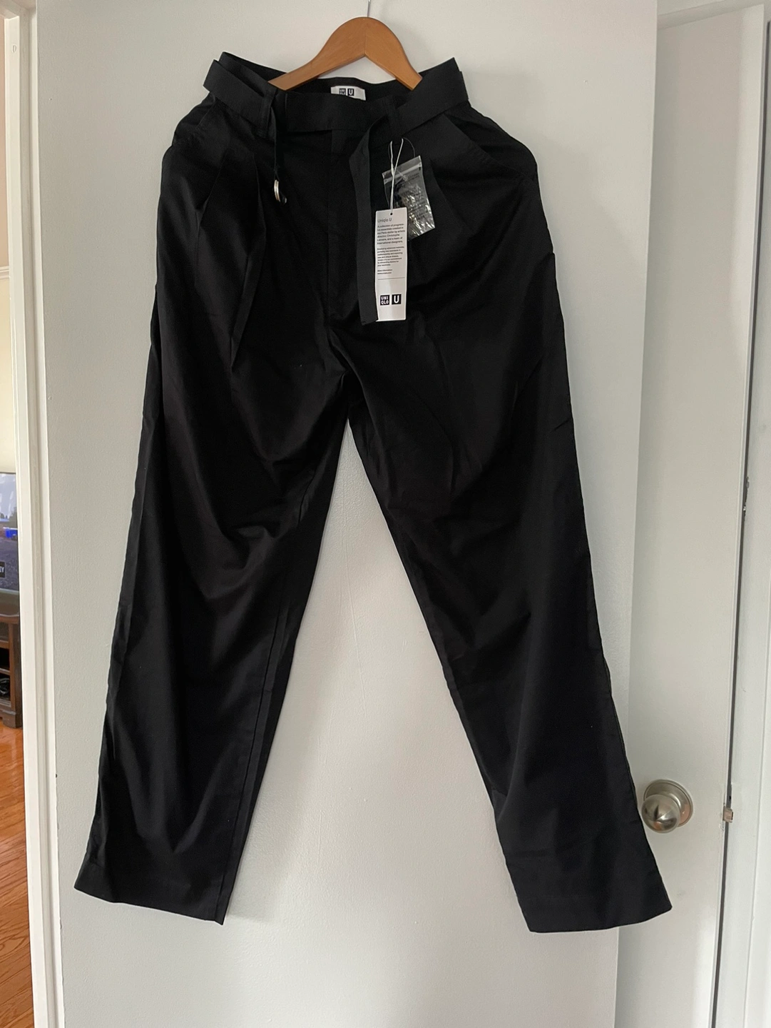 Black pants with a belt. They have pleats in the front and are a wide-leg style. They are size small. They have never been worn. They have the original tag still attached.