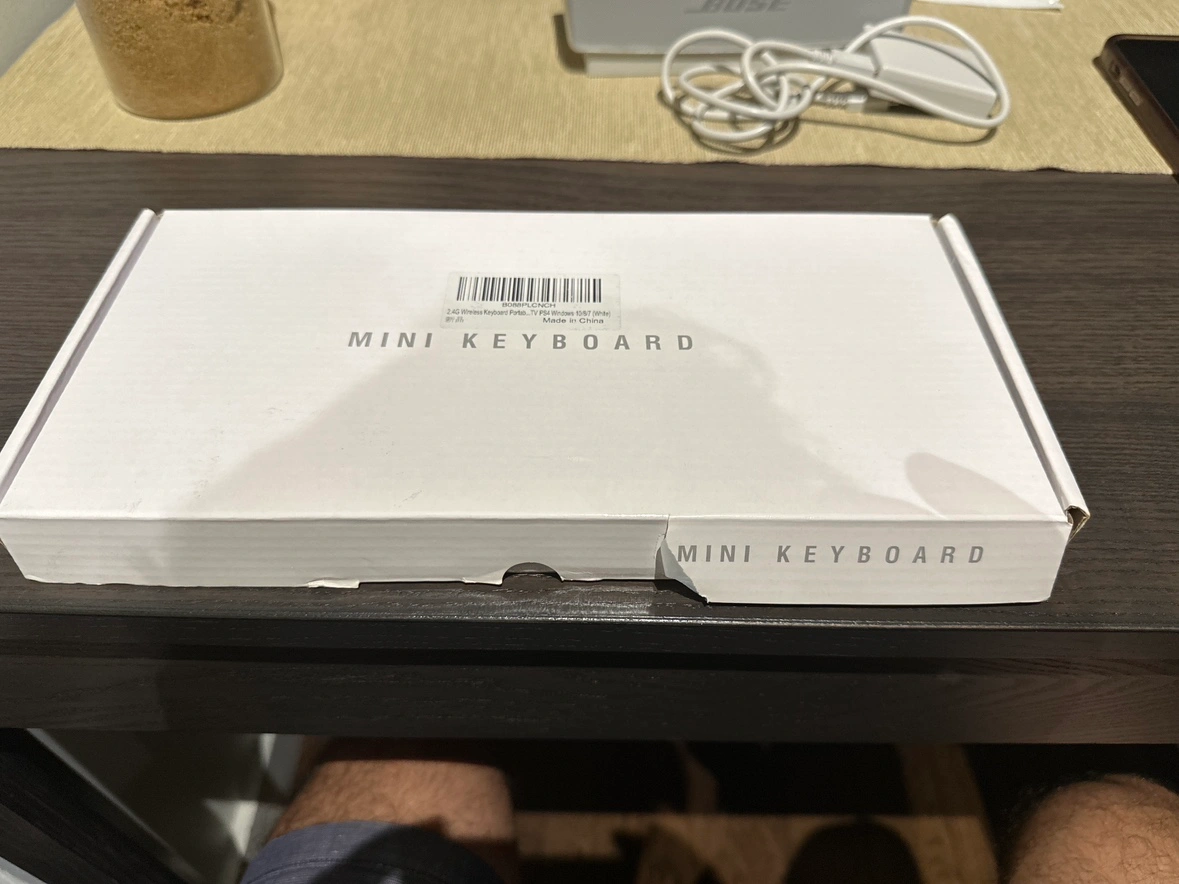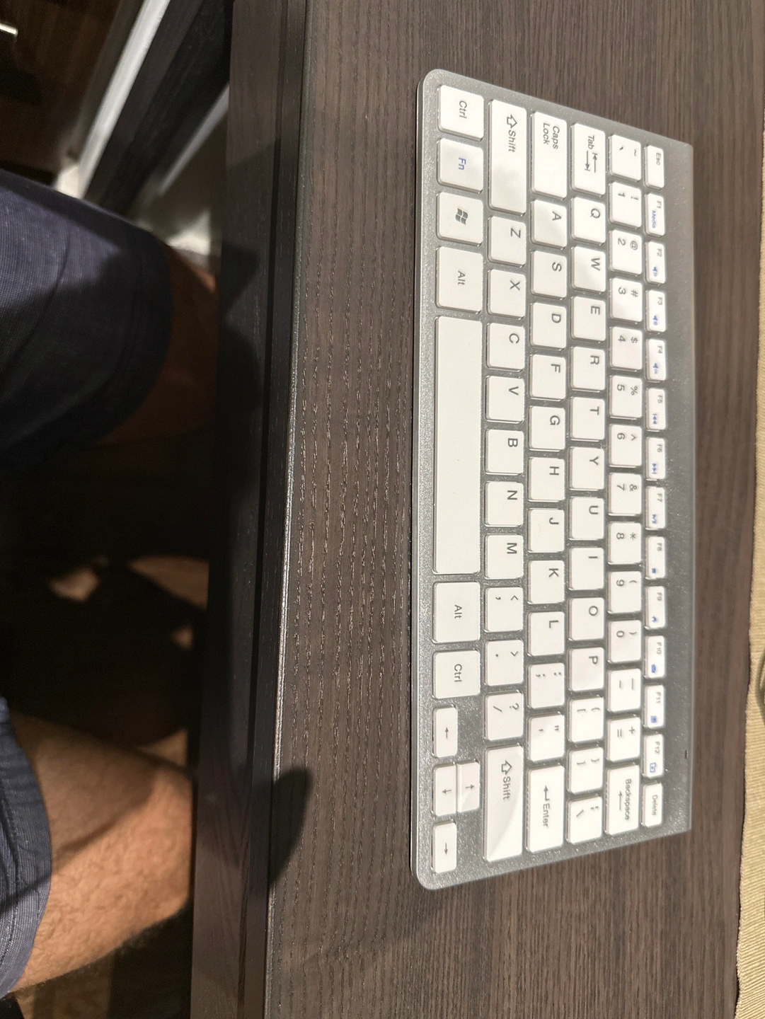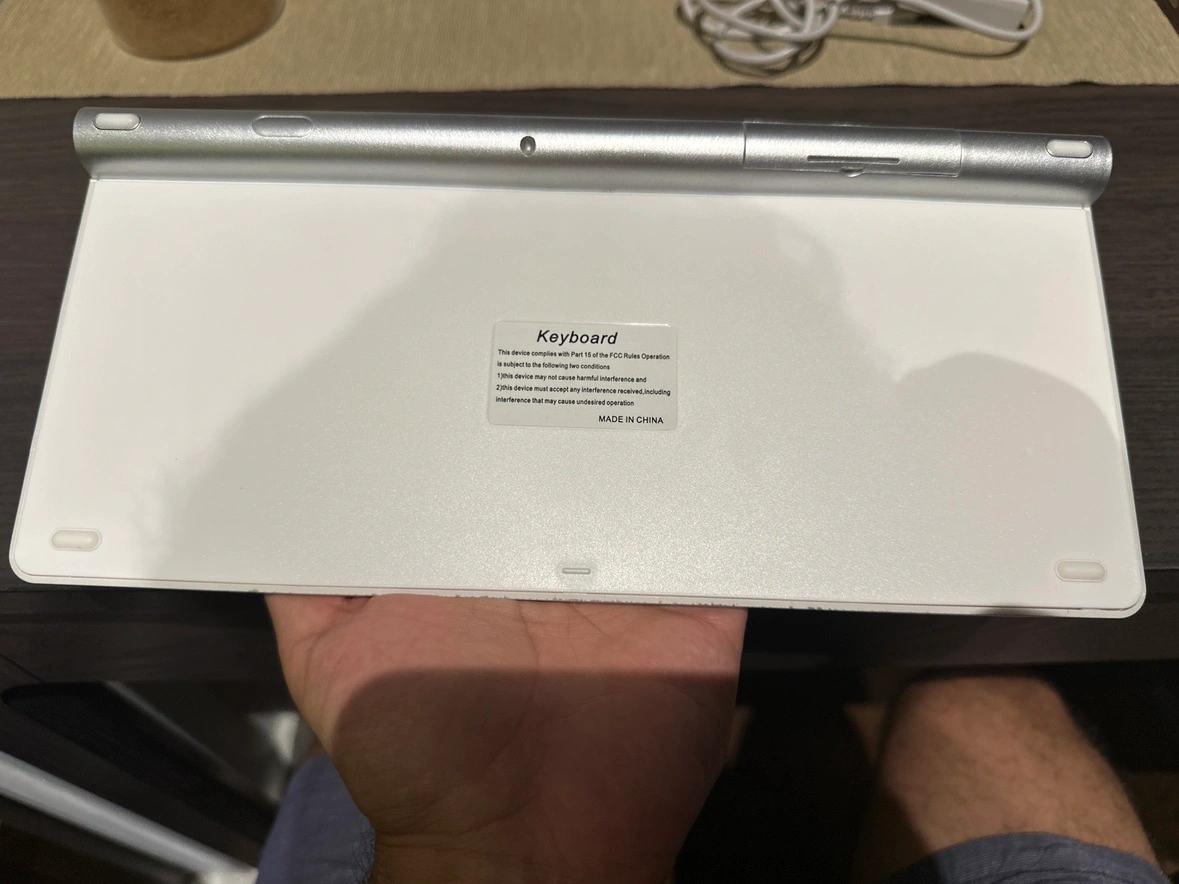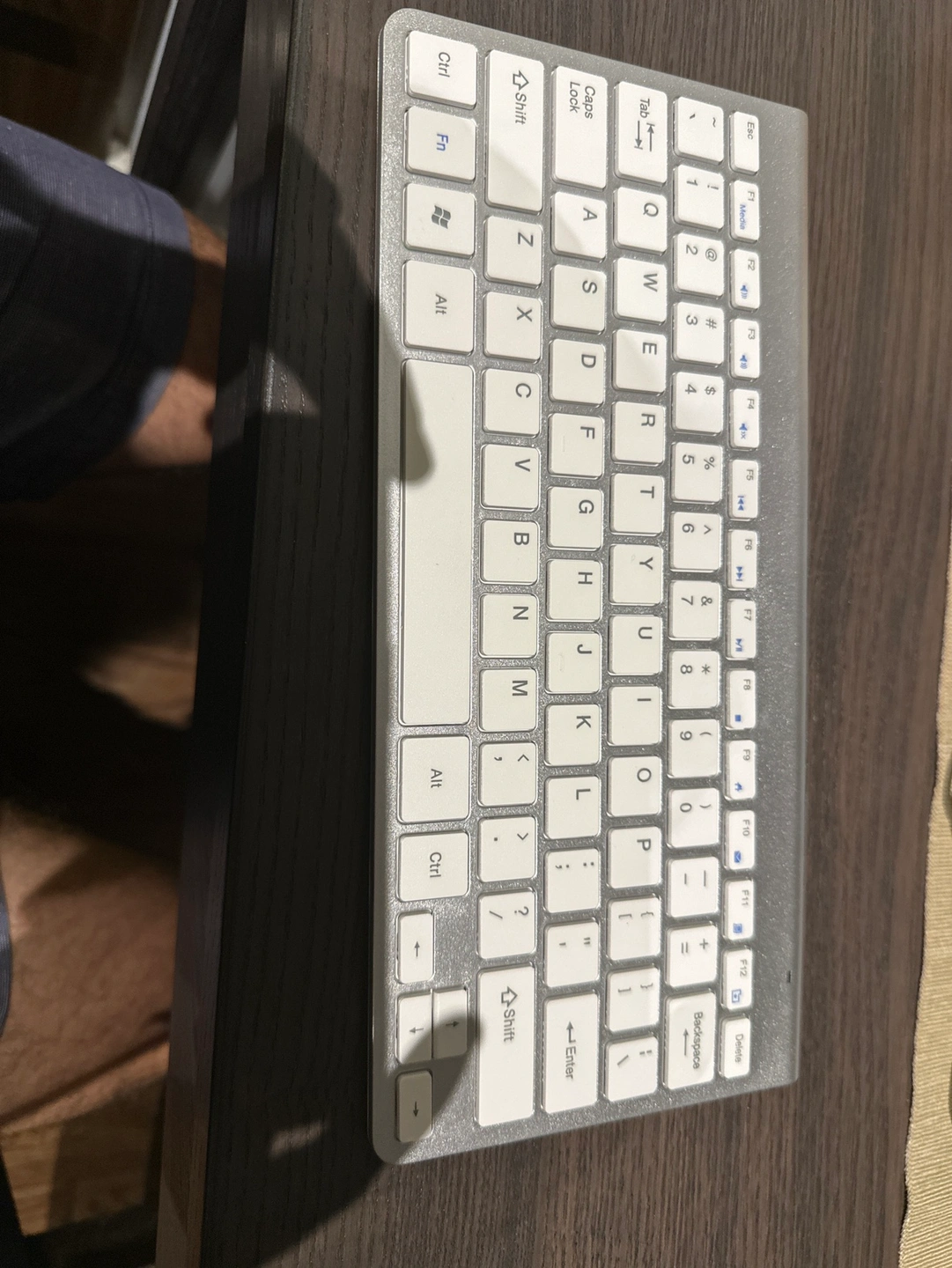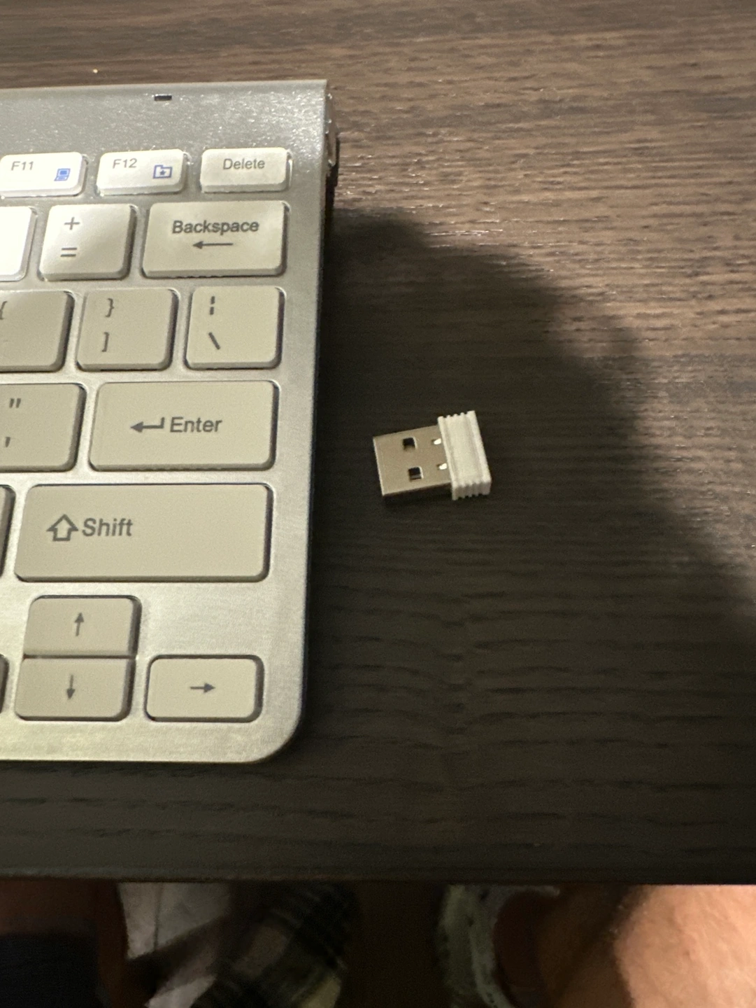 Silver wireless keyboard with USB receiver. This keyboard has an aluminum finish and a full keyboard layout.