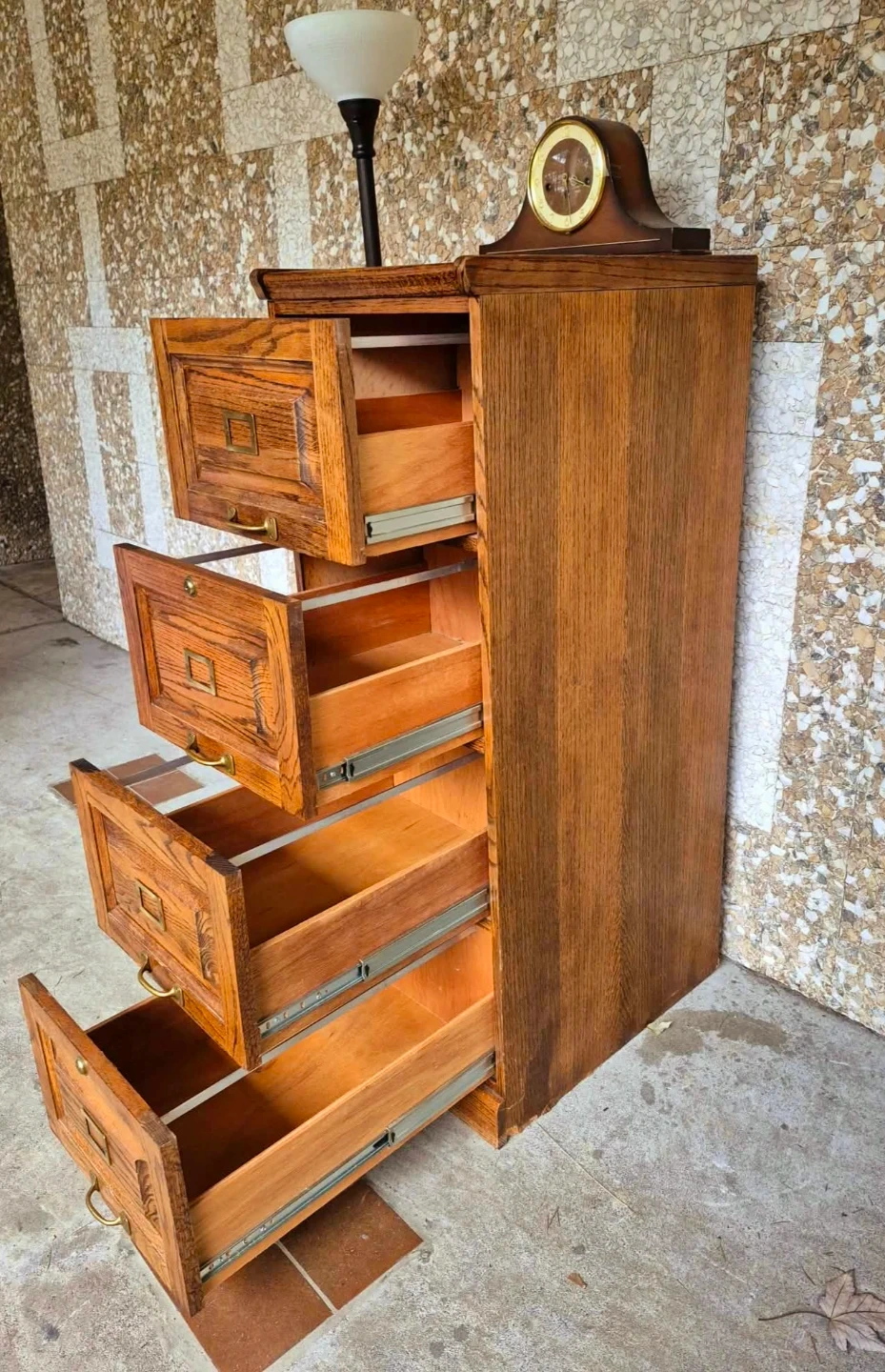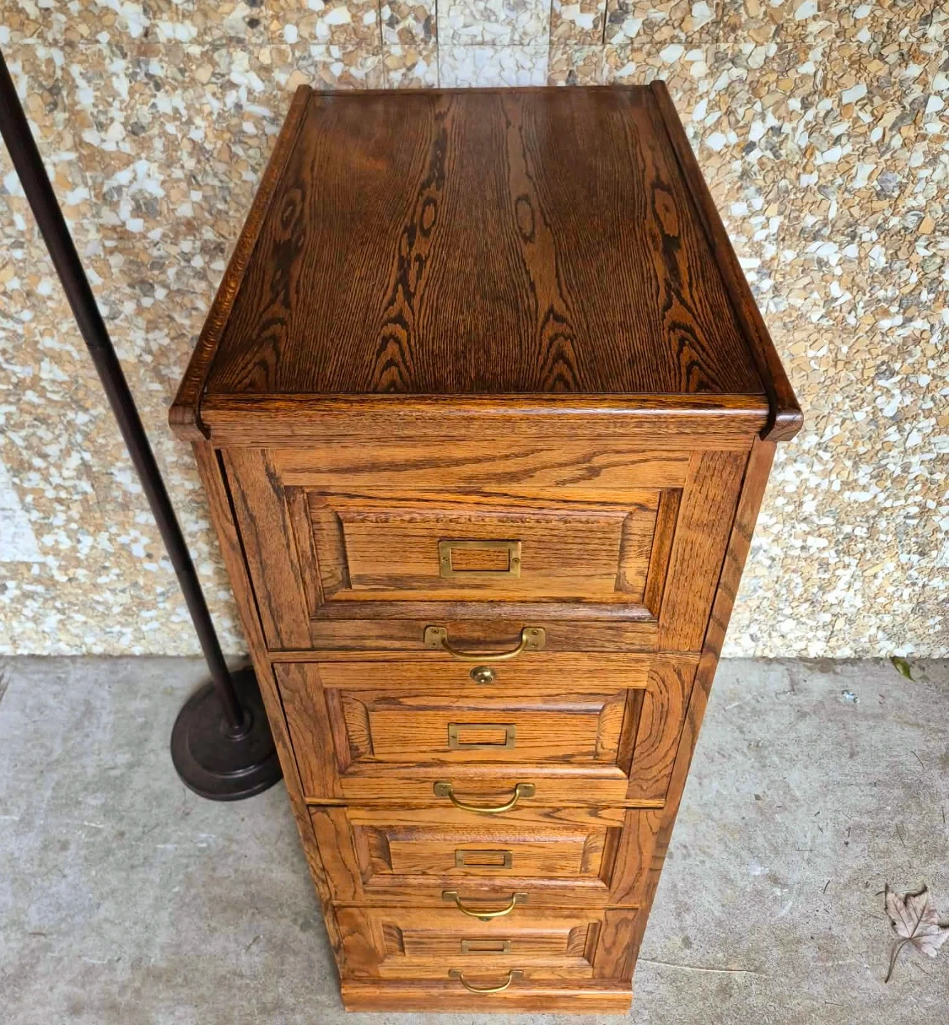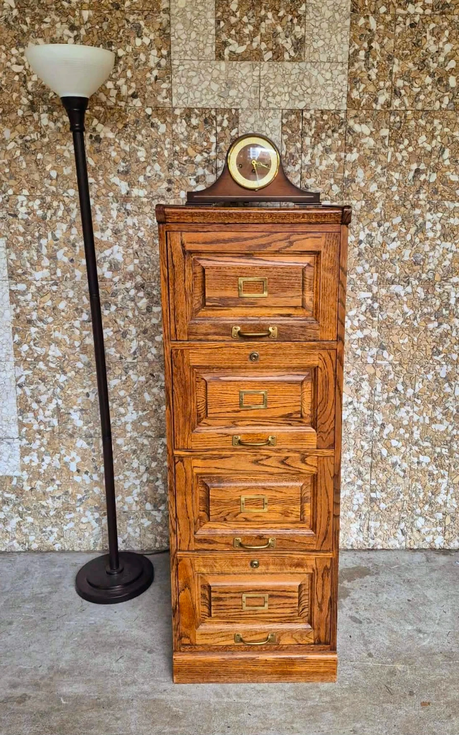 Vintage industrial style solid wood four drawer filing cabinet or dresser with original solid brass pulls.