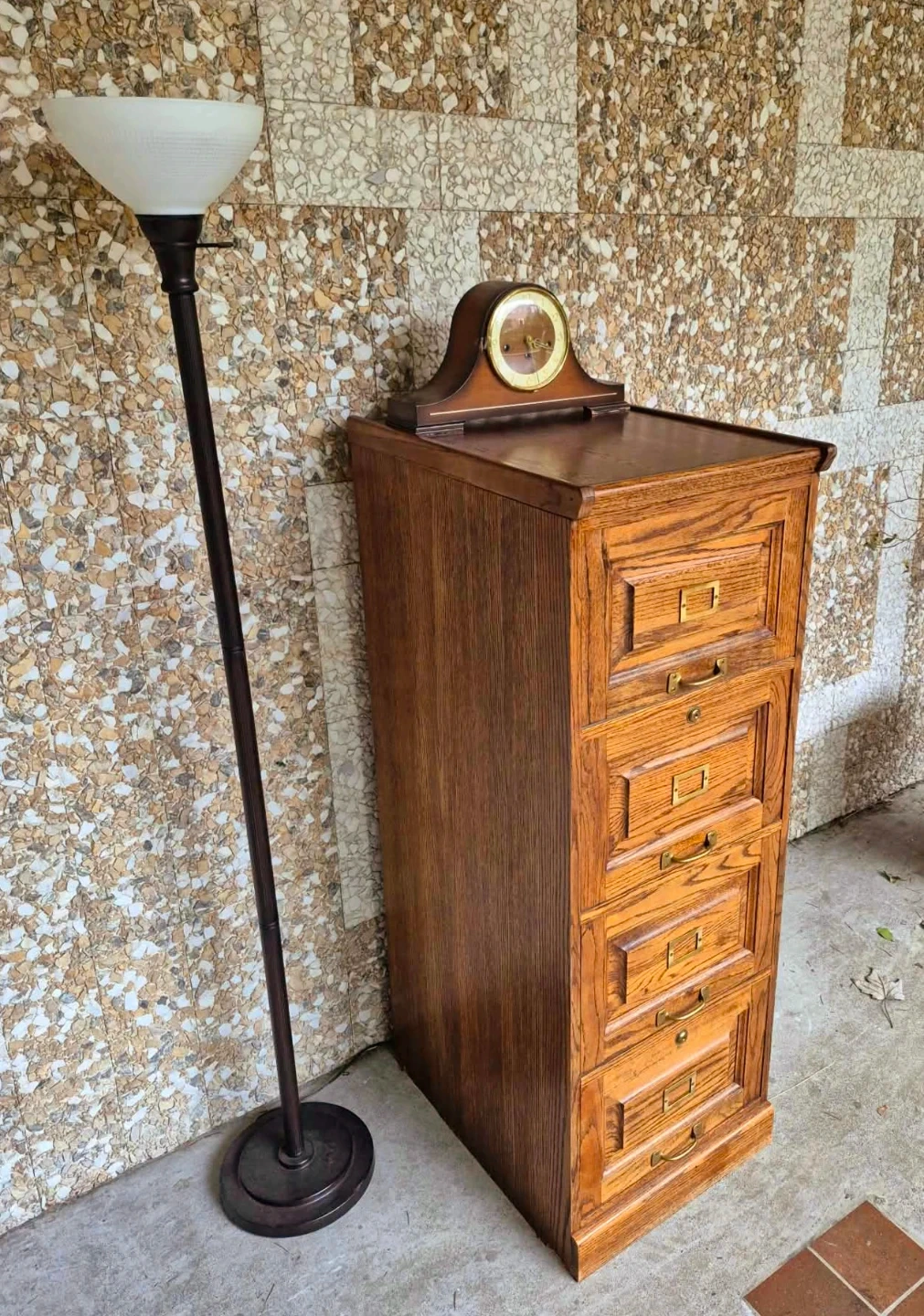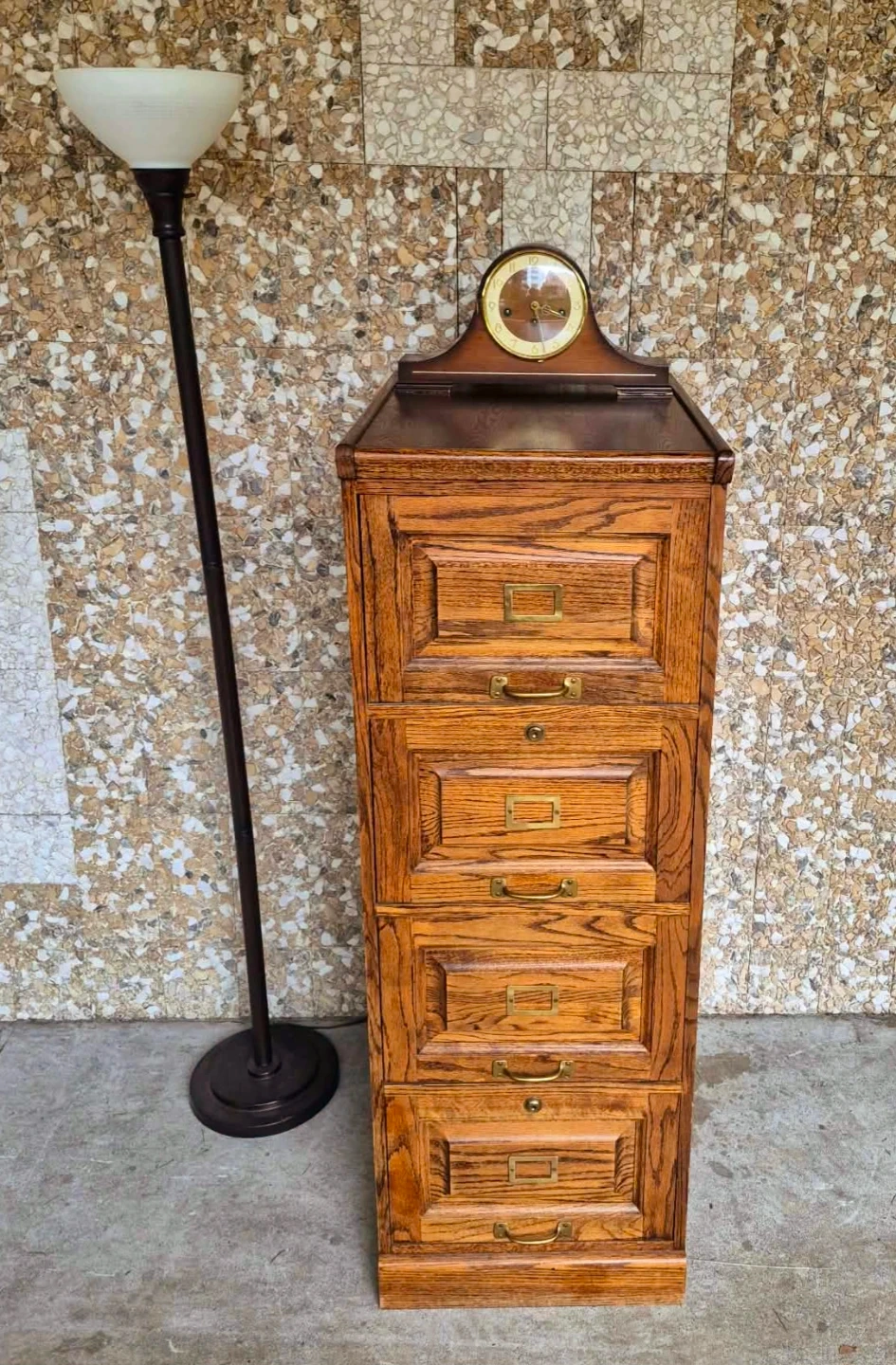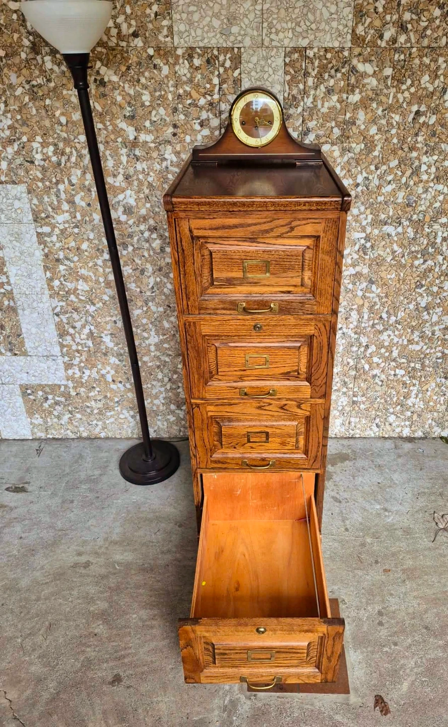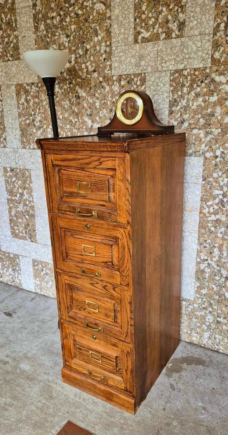 Vintage industrial style solid wood four drawer filing cabinet or dresser with original solid brass pulls.