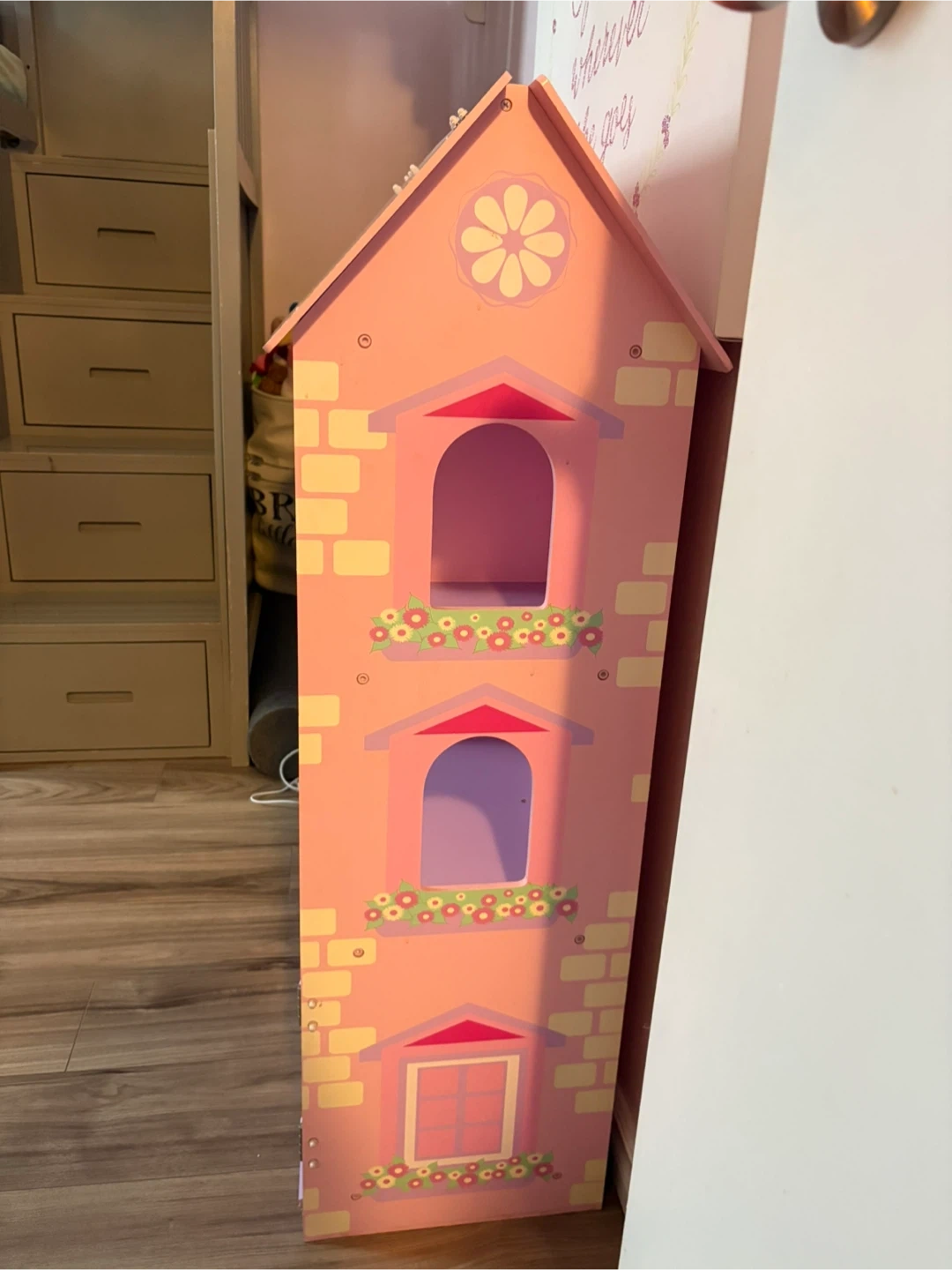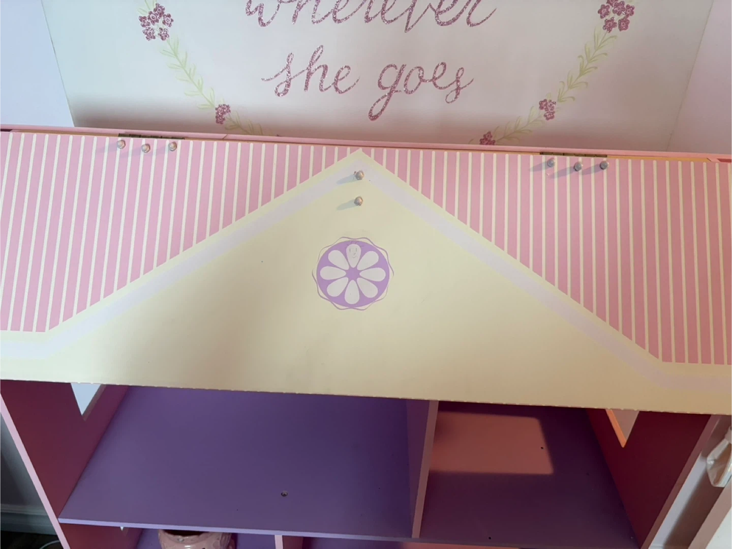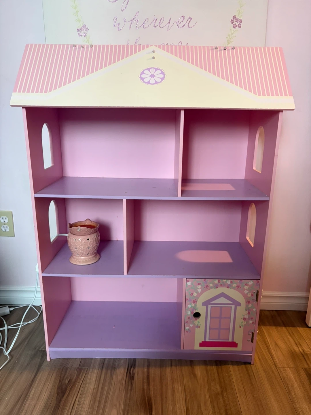 Cute storage with several compartments and a door that opens and closes. Top has hidden compartment. It's in good condition and ready for a new home for imaginative play.