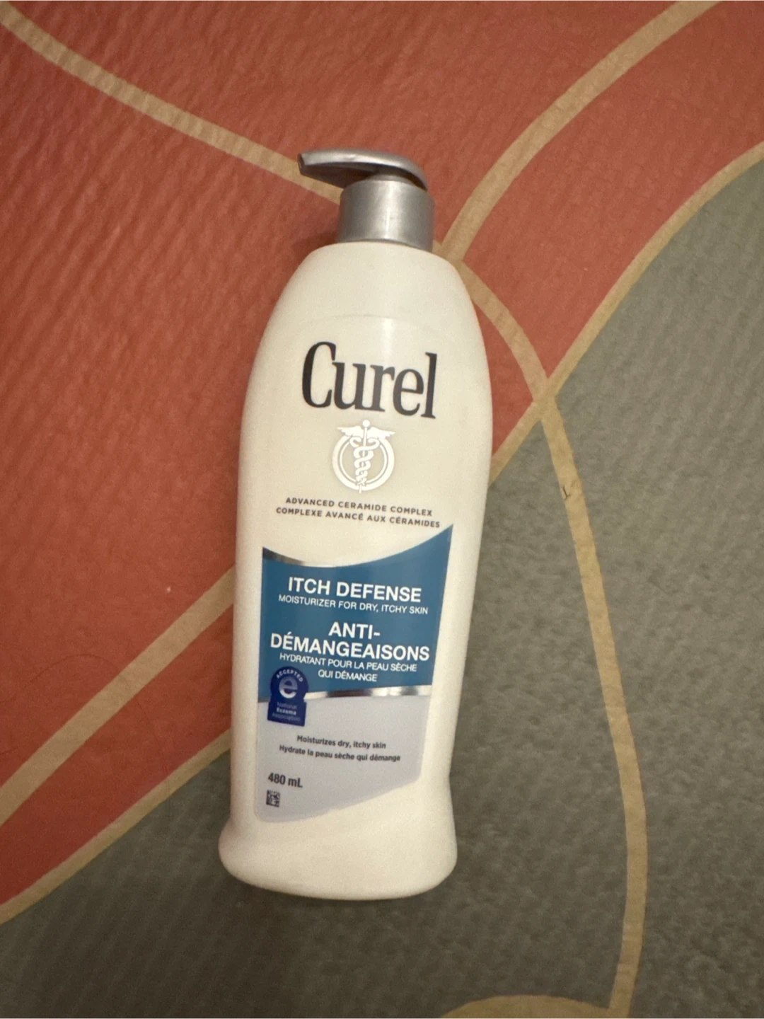 Curel Itch Defense moisturizer for dry, itchy skin. It moisturizes dry, itchy skin. 480 mL bottle.