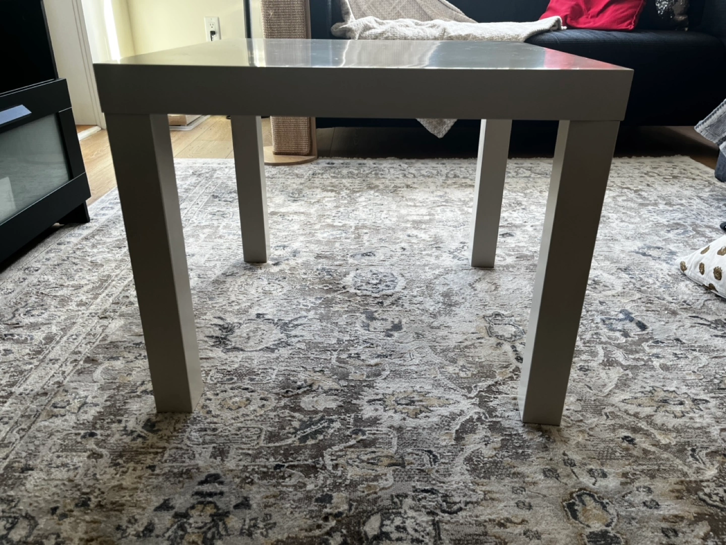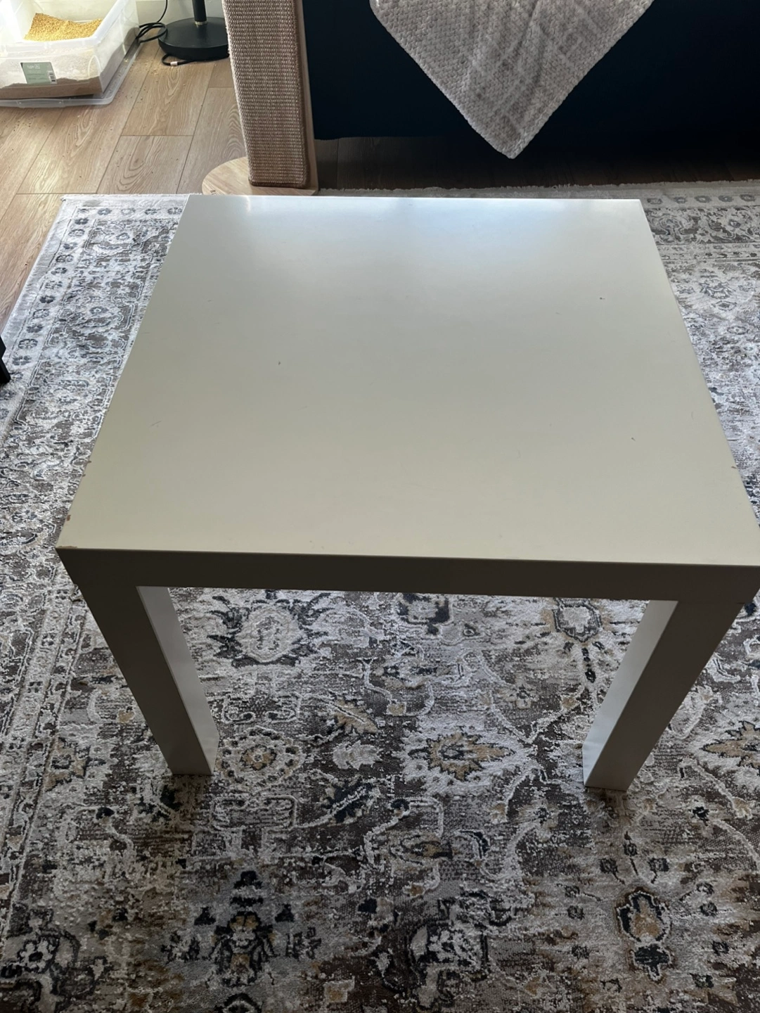 Small square coffee table. Off-white colour. Simple design. Four legs. Good for small spaces.