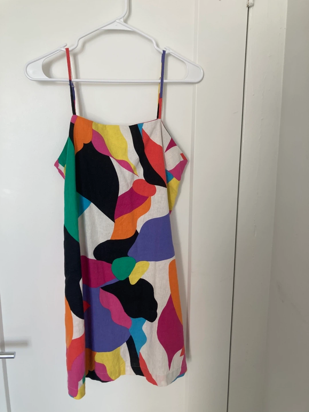 A fun and colourful dress! It has a unique pattern with black, orange, yellow, green, blue, and pink shapes on a white background. Perfect for adding a pop of colour to your wardrobe