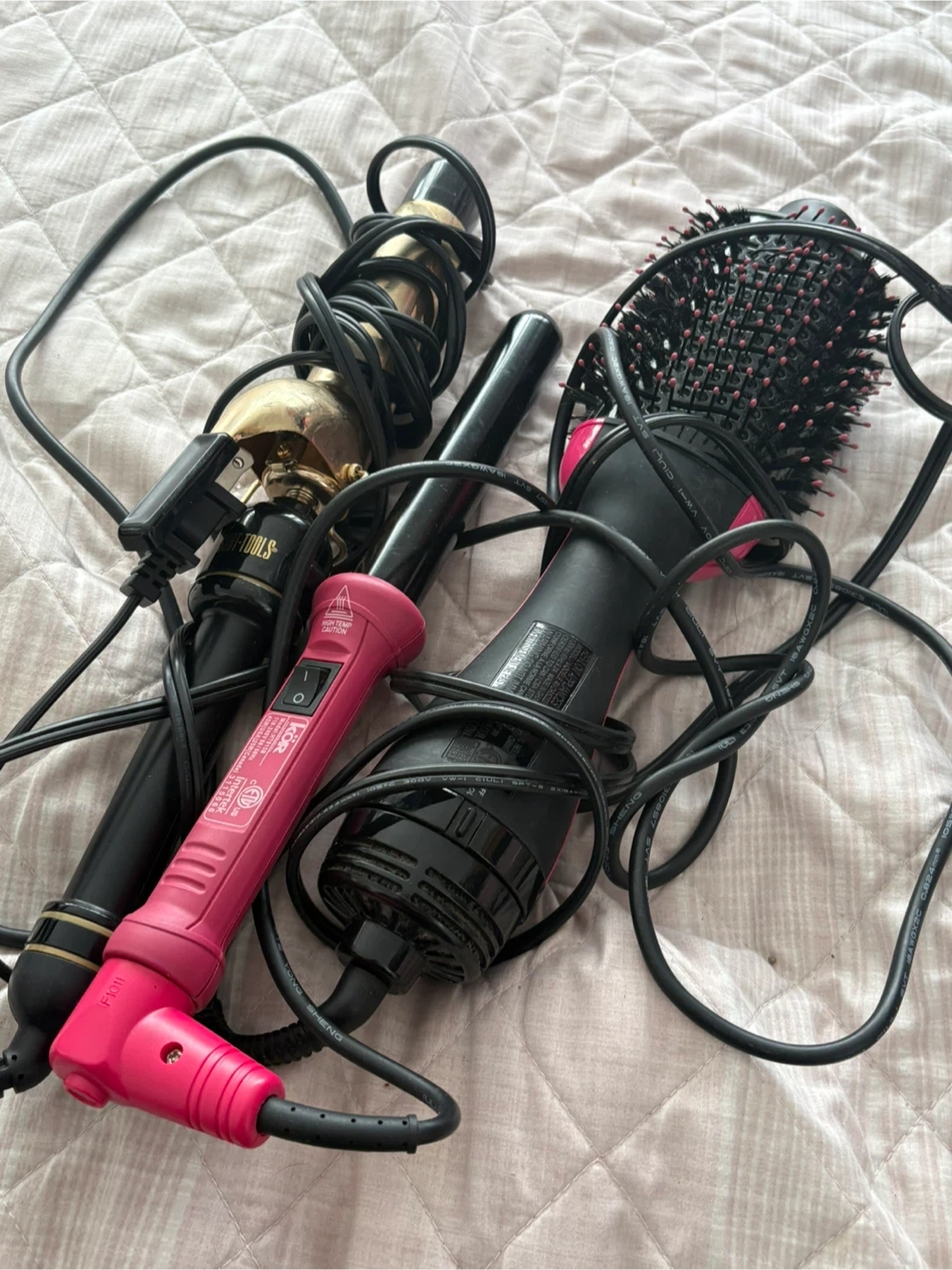 This set includes a Hot Tools curling iron with a gold barrel and a pink KÖR hair dryer brush. Both tools are designed for styling hair. They are ready for their next use!