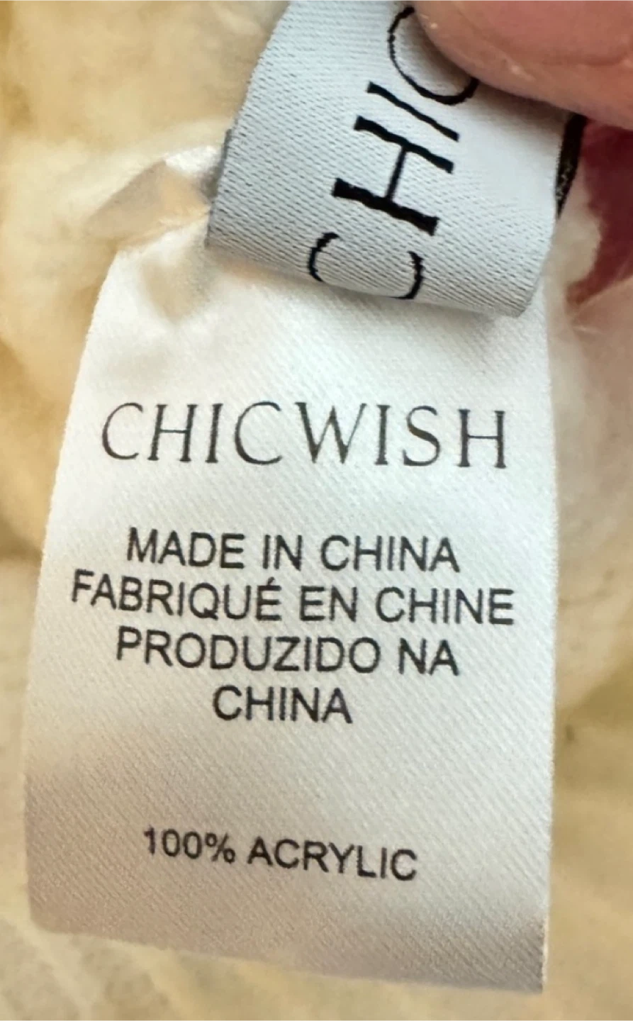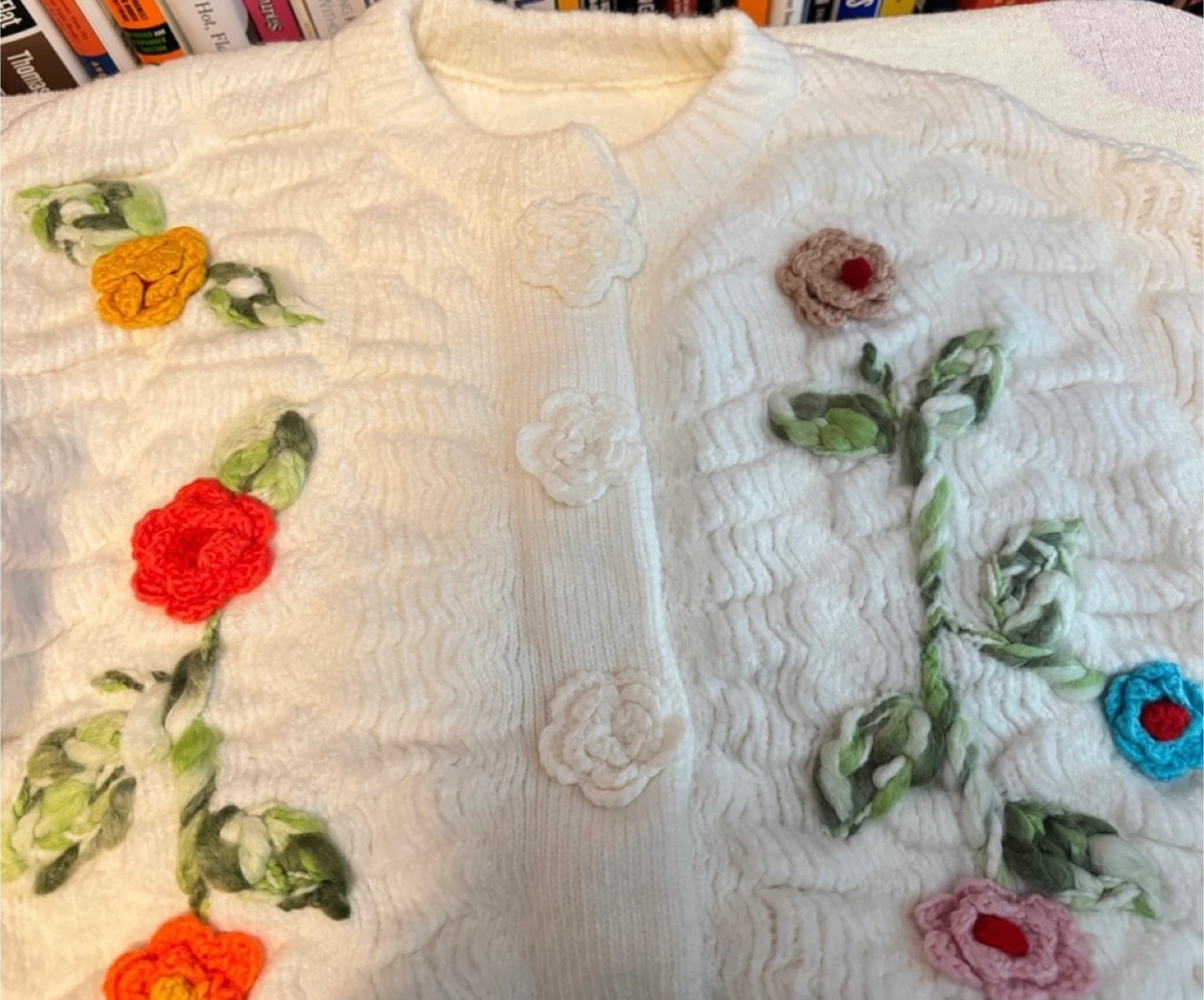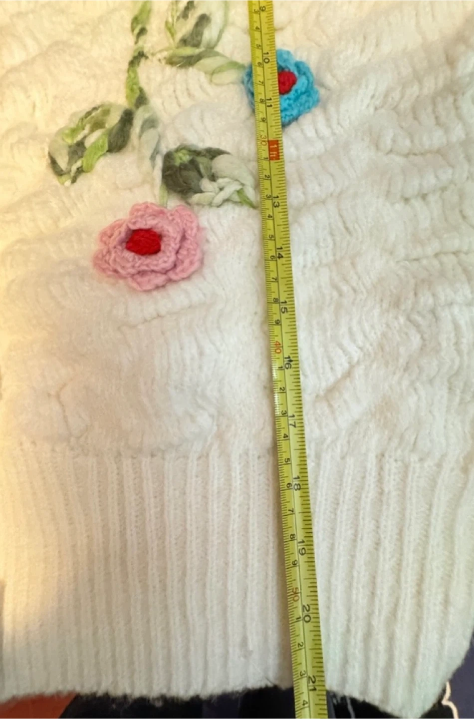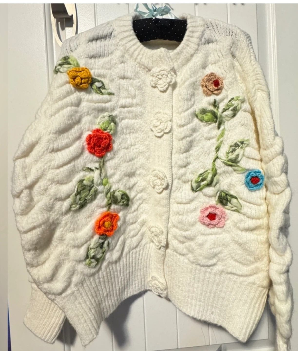 Selling a Chicwish cardigan in size small! It's a cream colour, made of 100% acrylic, and features beautiful floral appliques.
