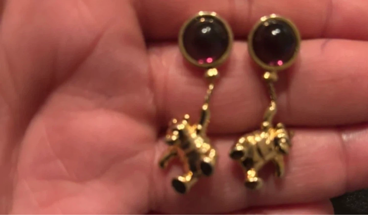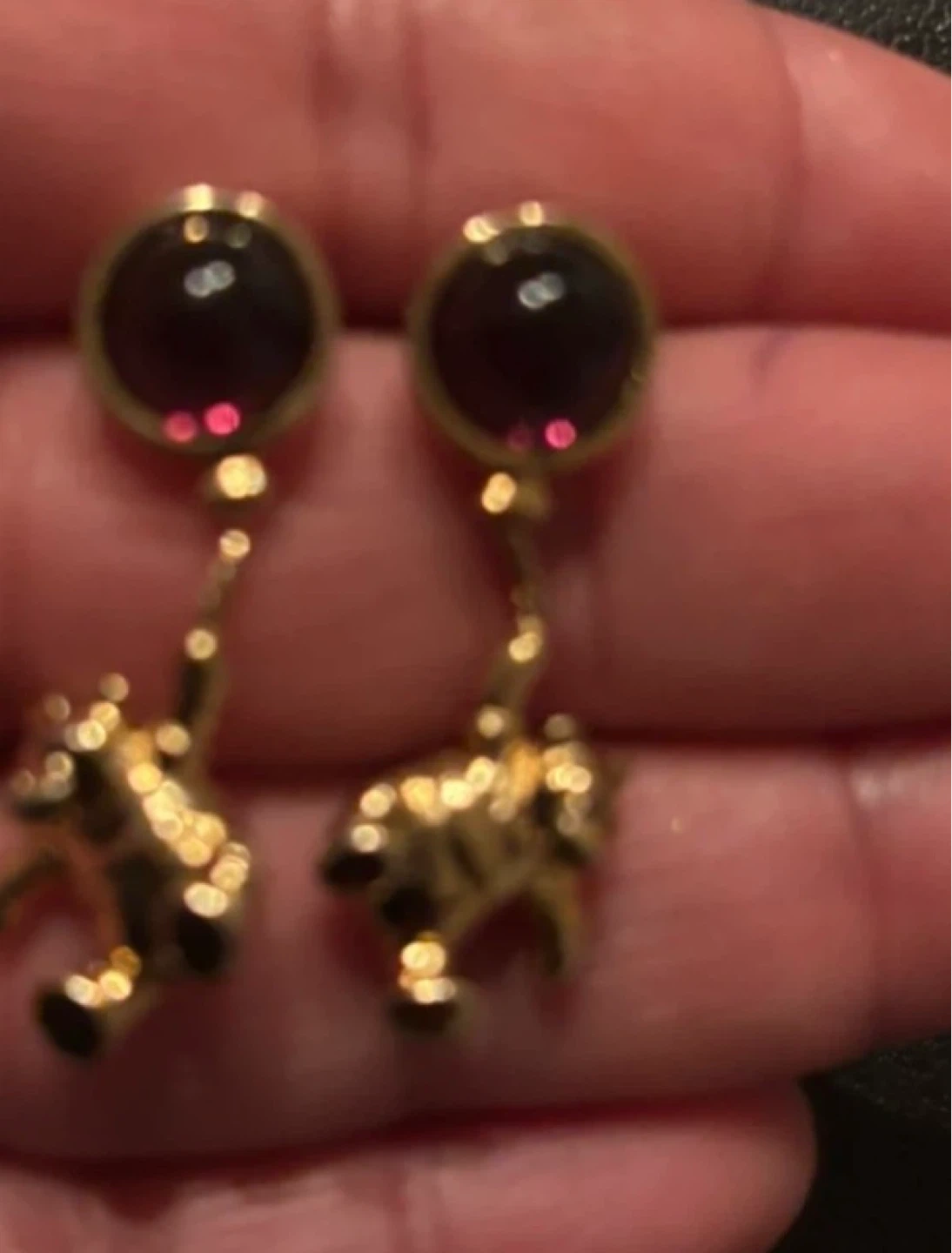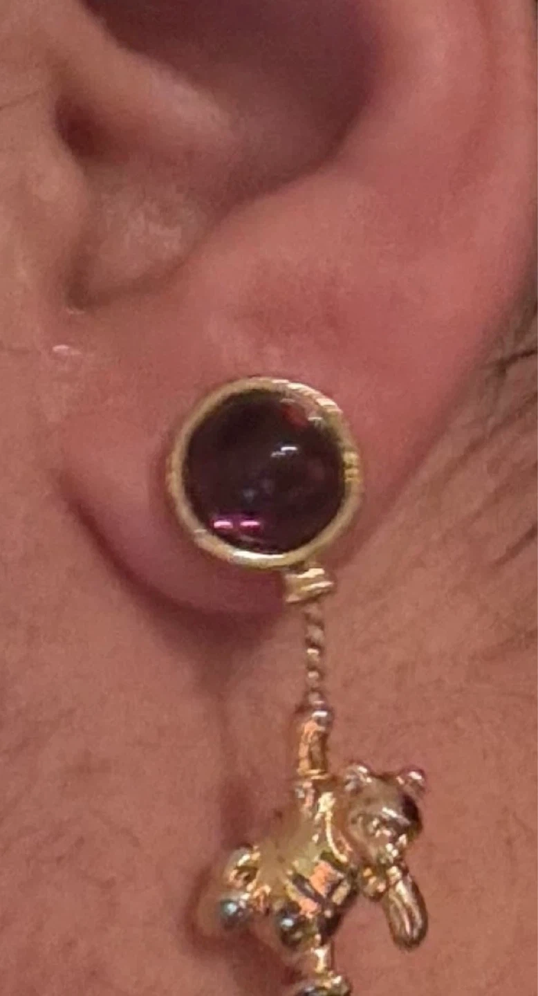 Cute gold-tone dangle earrings featuring a bear design. Each earring has a round purple gem stud. They're whimsical and fun!fixed price 30$